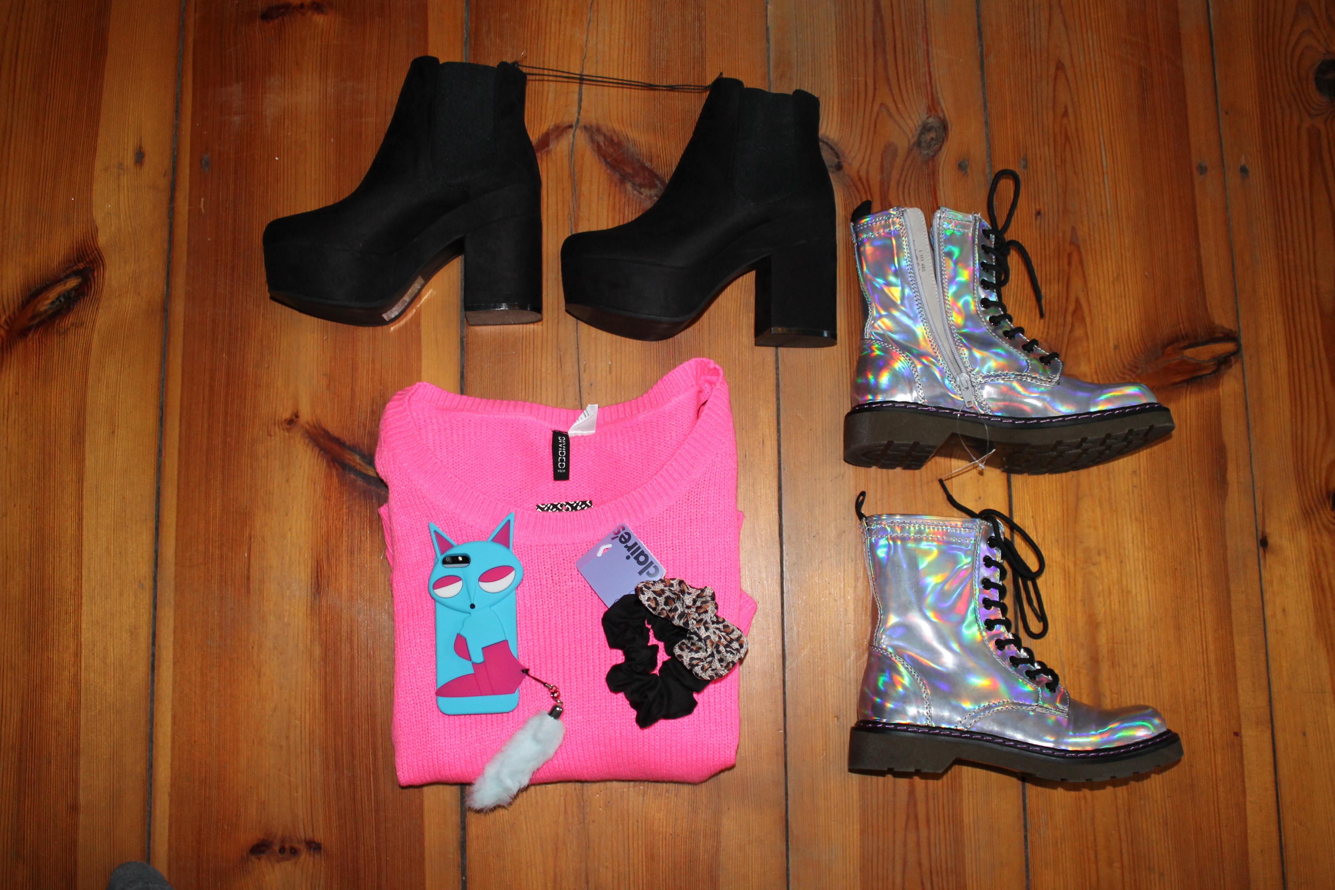The November starts just typical: gray and rain. So I decided to buy PINK and shiny ‚hologram‘ shoes…so maybe I’ll shine like the sun. The black h&m plateau boots are high, but comfortable and easy to wear for me through the plateau.