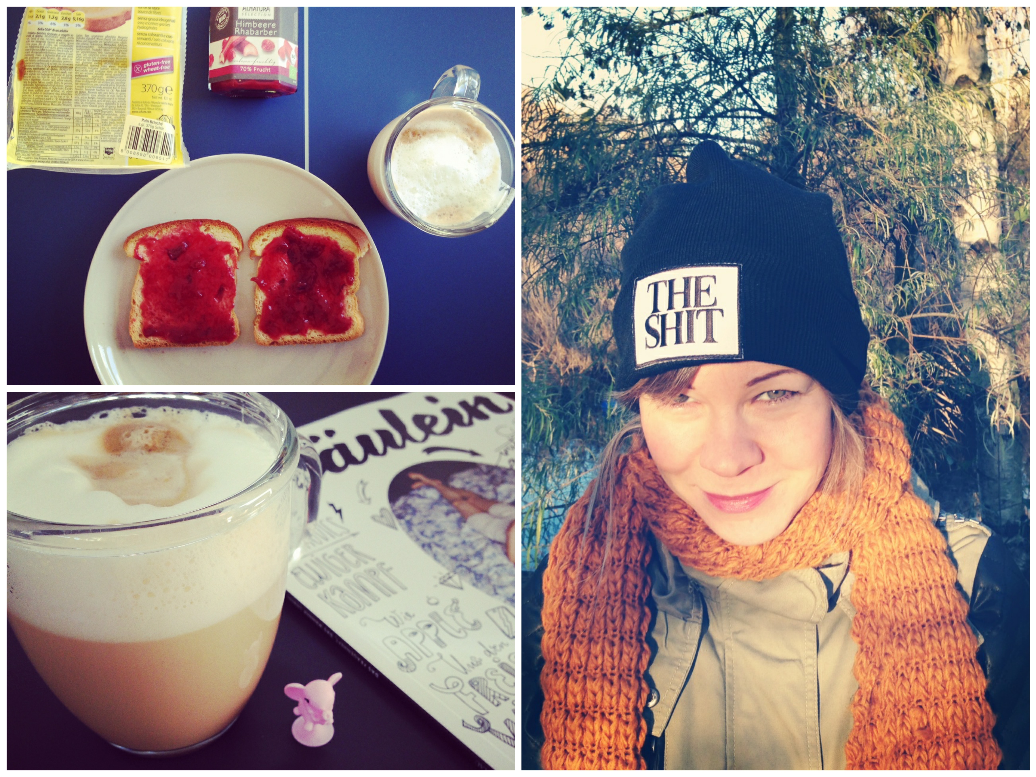 Last Monday morning I was smiling because the sun was shining and I was wearing my new beanie from ‚the shit shop‘. On my way to work I bought me the ‚Fräulein‘ magazine and drunk a tasty coffee. On Tuesday I presented you one of my favorite lipsticks. It’s the ‚Manhatten Lips2last‘. It lasts all day long. For the sweet lunch I ate a gluten-free bread with ‚Alnatura‘ jam -raspberry. On Wednesday I was wearing my new cat bag. It was a gift and I was happy about it.