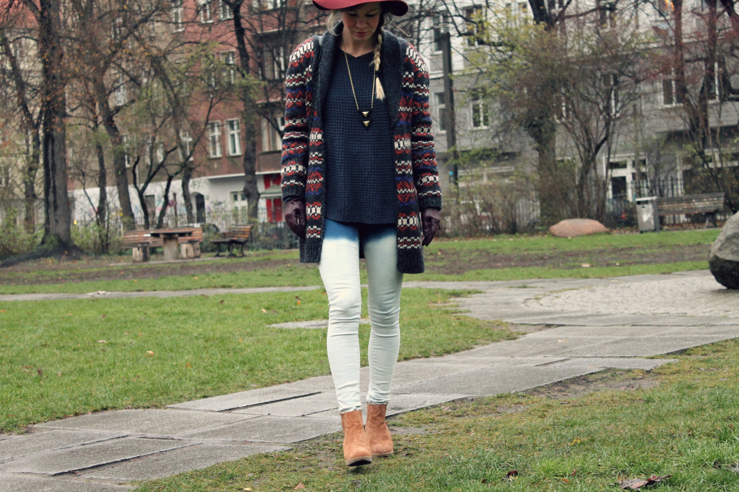 Beim vergangenen Sonntagsshooting war es sehr kalt draußen. Ich trug ein paar Teile aus der letzten Saison und dazu mal einen Hut. Ich mag Mützen, Hüte und caps sehr, besonders an ‚bad hair days‘. Mein kürzlich erworbener Cardigan von Primark schüzte mich vor der Kälte an diesem Nachmittag. Wegen des Tiger-Prints, mag ich diesen Strickmantel besonders gern.