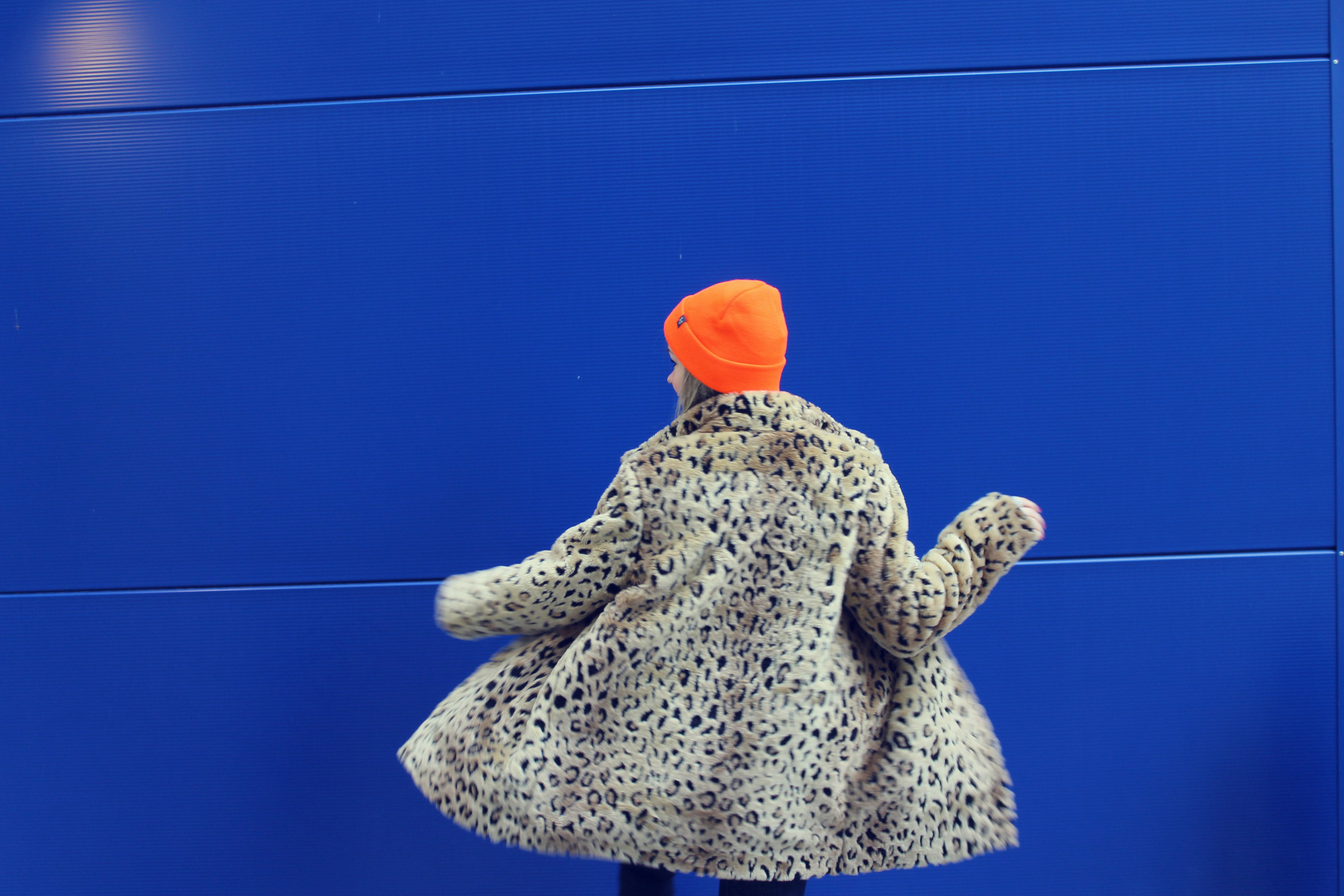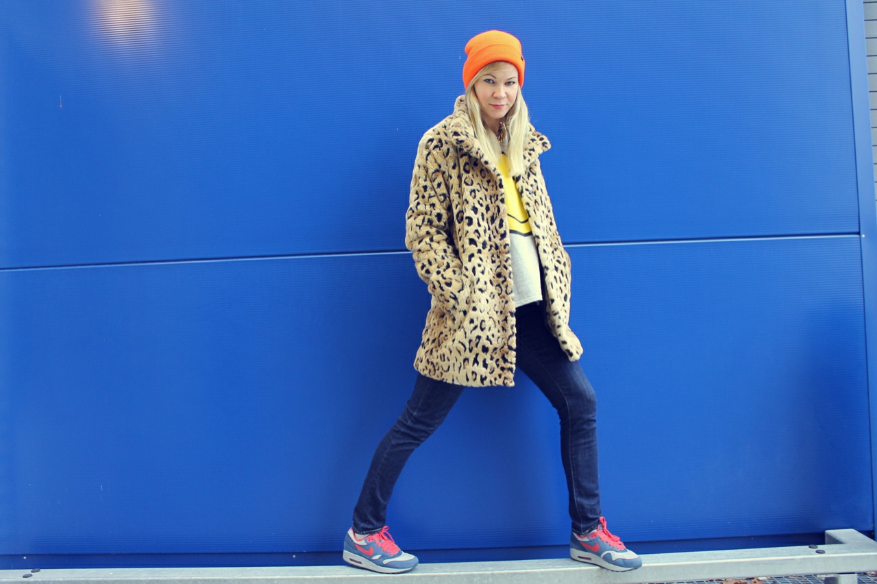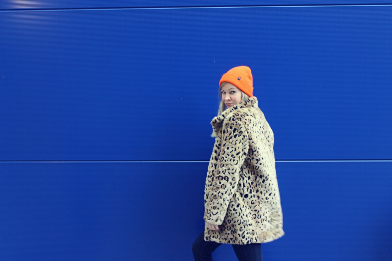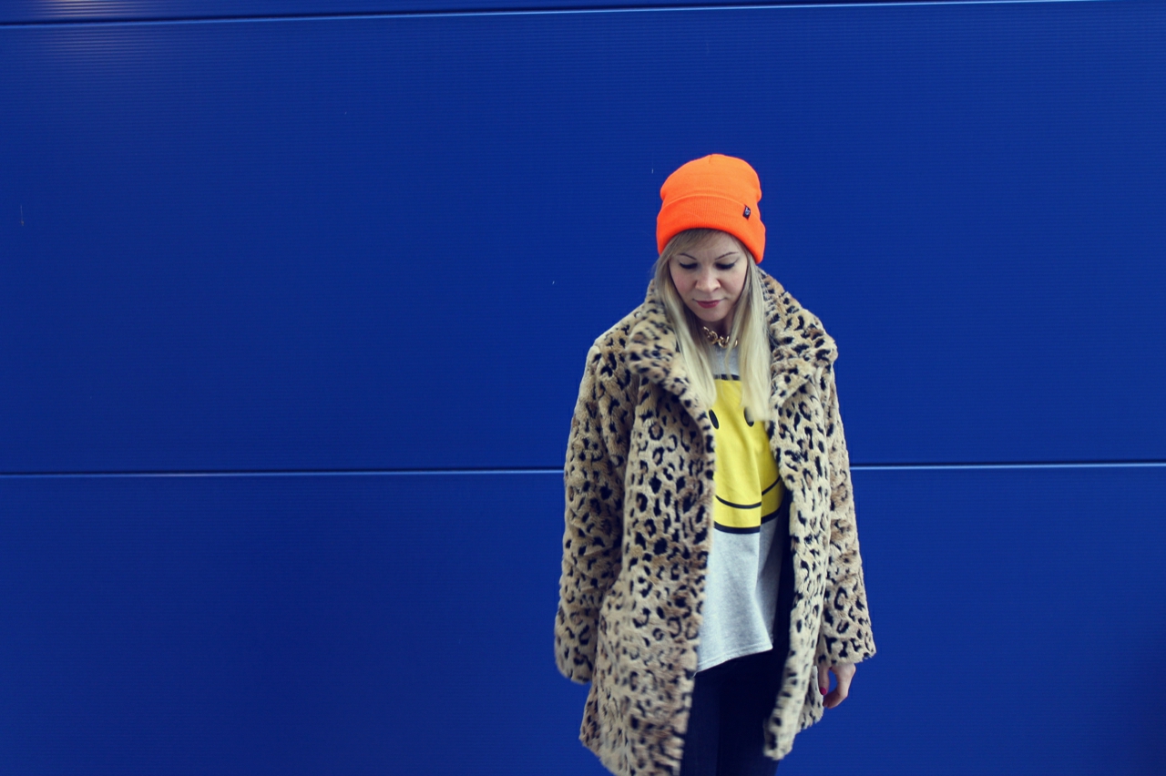 I love Ikea! Not only because there are great things to buy but also because the exterior facade provides good photo backgrounds. Once before I’ve photographed a Oufit at Ikea. The blue wall goes well with my orange neon hat and my new leopard jacket. For the jacket I’m lurking quite a while. It won’t go out of my head and then I still bought.