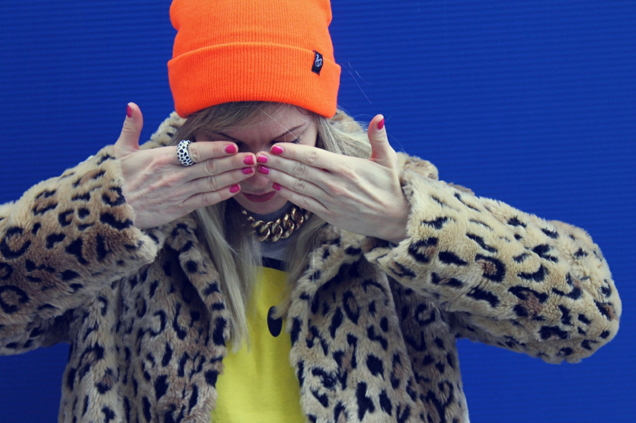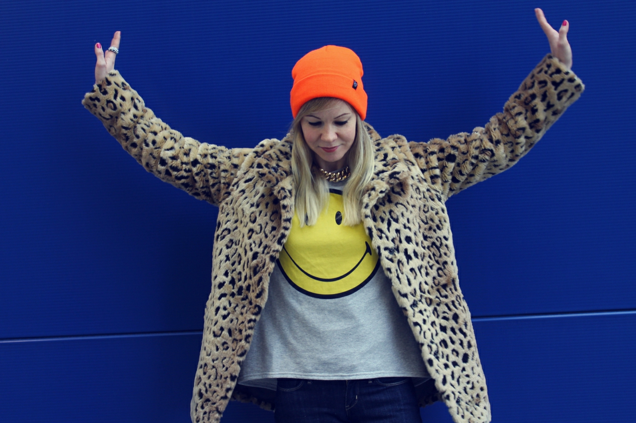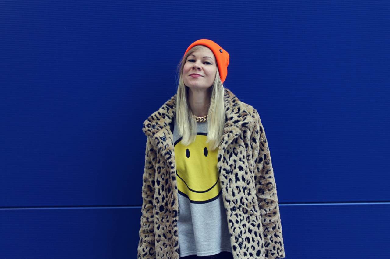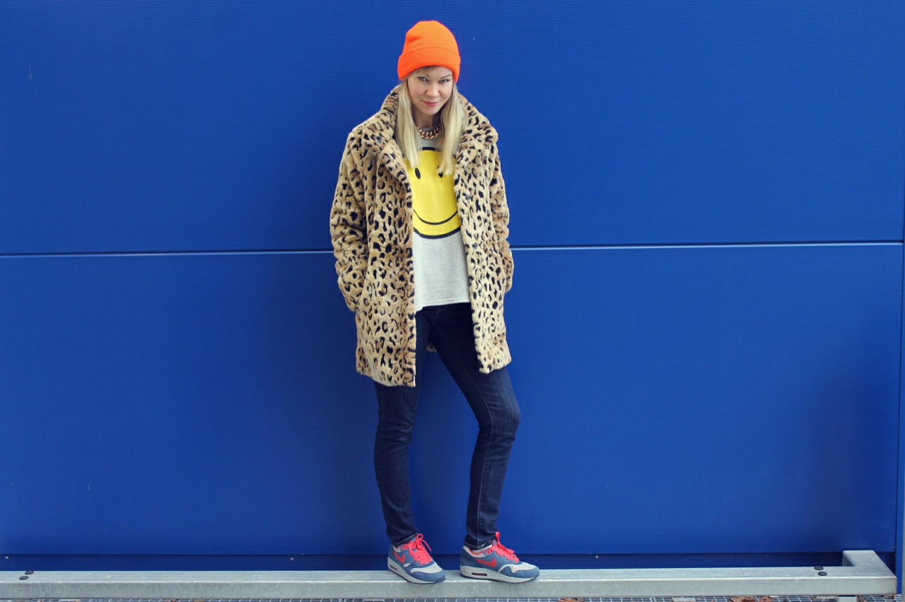 I love Ikea! Not only because there are great things to buy but also because the exterior facade provides good photo backgrounds. Once before I’ve photographed a Oufit at Ikea. The blue wall goes well with my orange neon hat and my new leopard jacket. For the jacket I’m lurking quite a while. It won’t go out of my head and then I still bought.