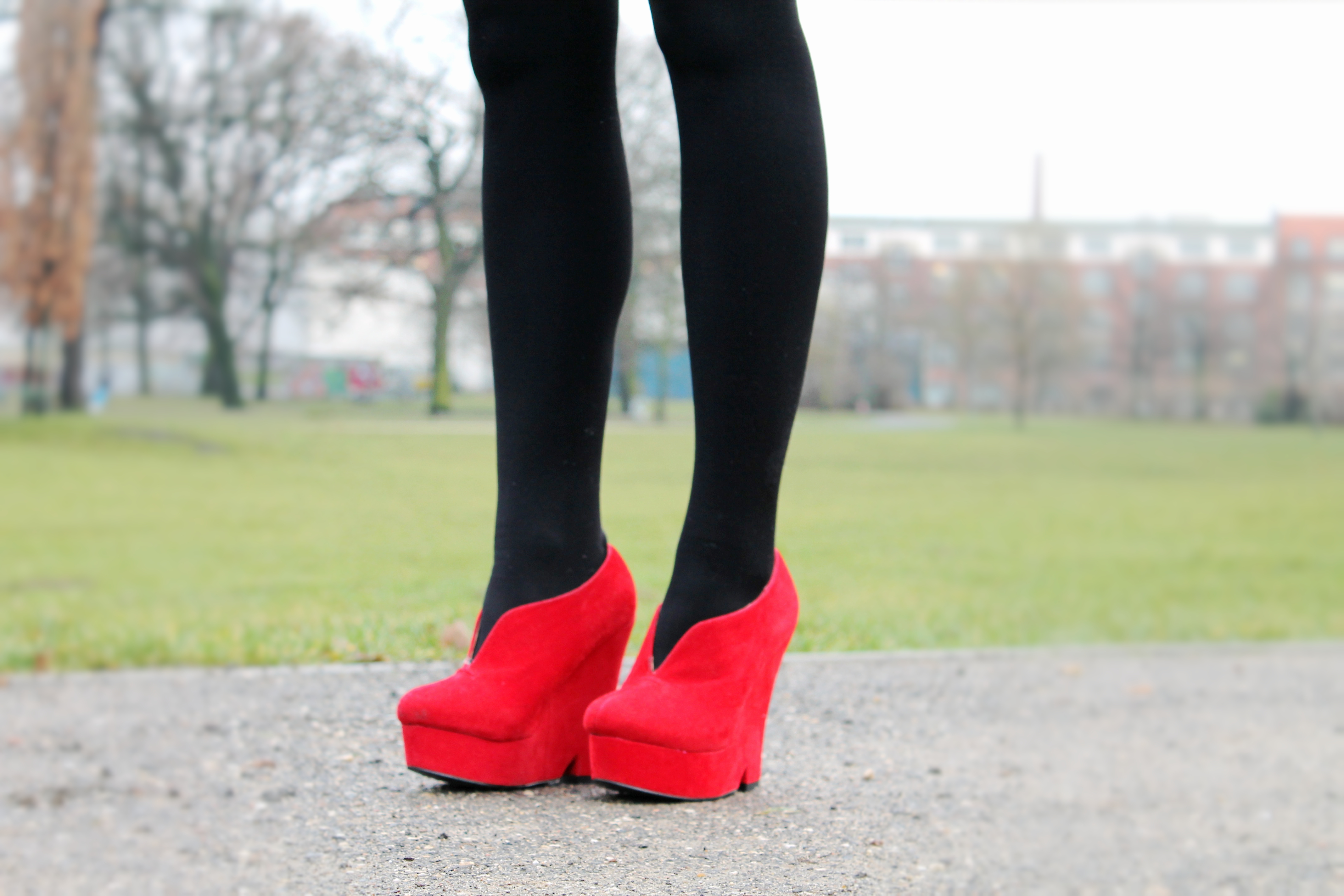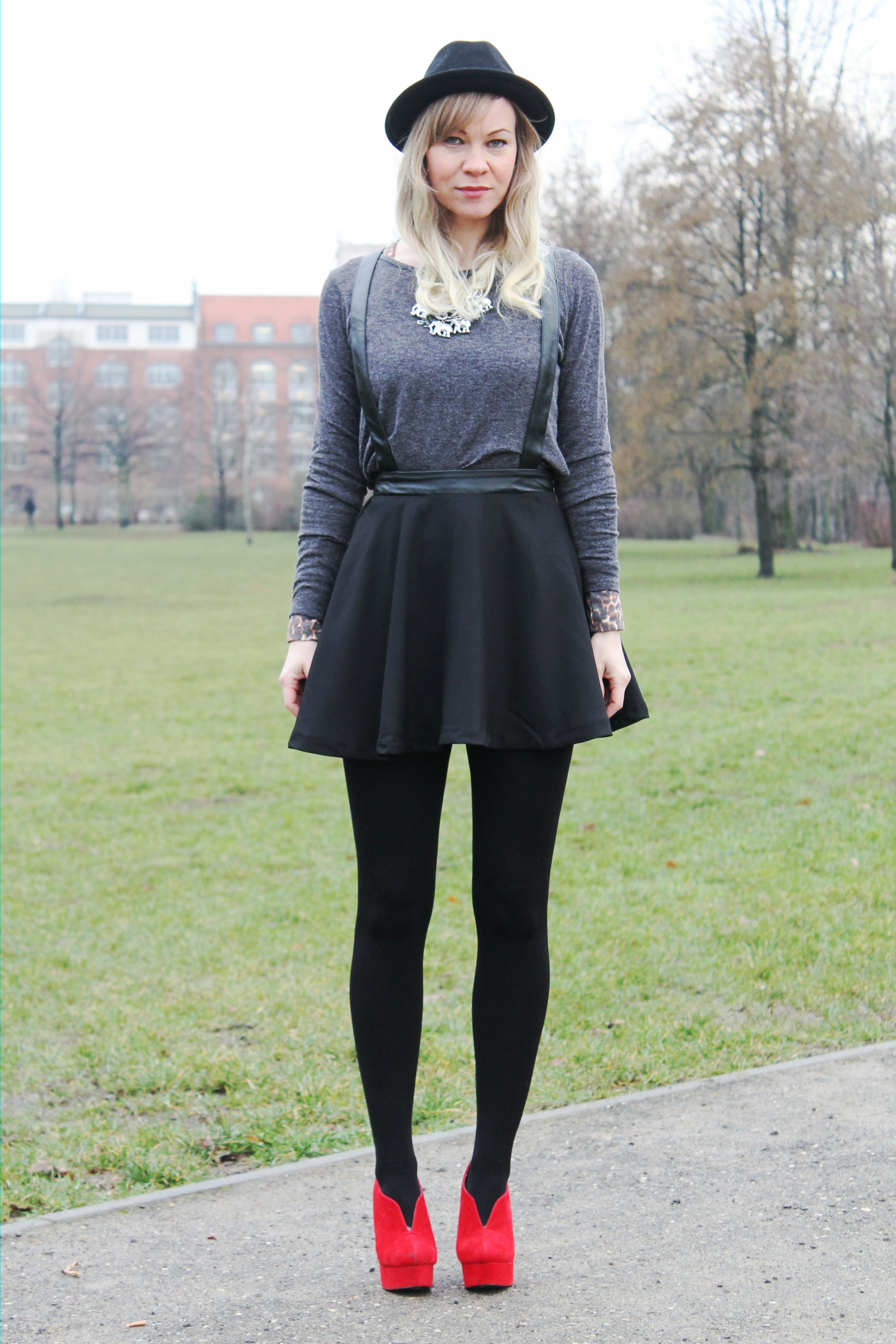 Just in time for outfit shooting yesterday it started to rain in Berlin Kreuzberg. In the picture below you can see all the little raindrops on my hat. But there were only a few drops, so it feels like a spring rain because of the mild temperatures already. I wear my new skirt from one of my favorite shops ‚ Broke + Schön‚ (currently they don’t have an online shop). I’ve done some more posts with outfits from this wonderful shop. There are 2 shops in Berlin, one in Mitte and one in Friedrichshain. On weekends I often walk through Friedrichshain, most of the time on Sundays to walk to the flea market at ‚Boxhagener Platz‘. Basically then I press my nose to the ‚Broke + Schön‘ shop window to discover the latest pieces. So one Sunday I discovered this skirt hanging in the shop window. It was a fascinating sight like a thunderstruck. I could hardly sleep in the night from Sunday to Monday until I was finally able to buy him and could see him as my property. That was quite convenient because my stage outfit for the concert with my band last Saturday was finished. Here you can watch the stage outfit. Matching to this black skirt I like my hat from H & M and my very favorite red blood shoes. They seem a little uncomfortable by their extravagant appearance but because of the plateau sole they aren’t. I wore them even to a band photo shoot here . This shooting is 1,5 years ago you can see it on my completely bleached hair although these shoes have a special place in my shoe collection and occasionally they are used.