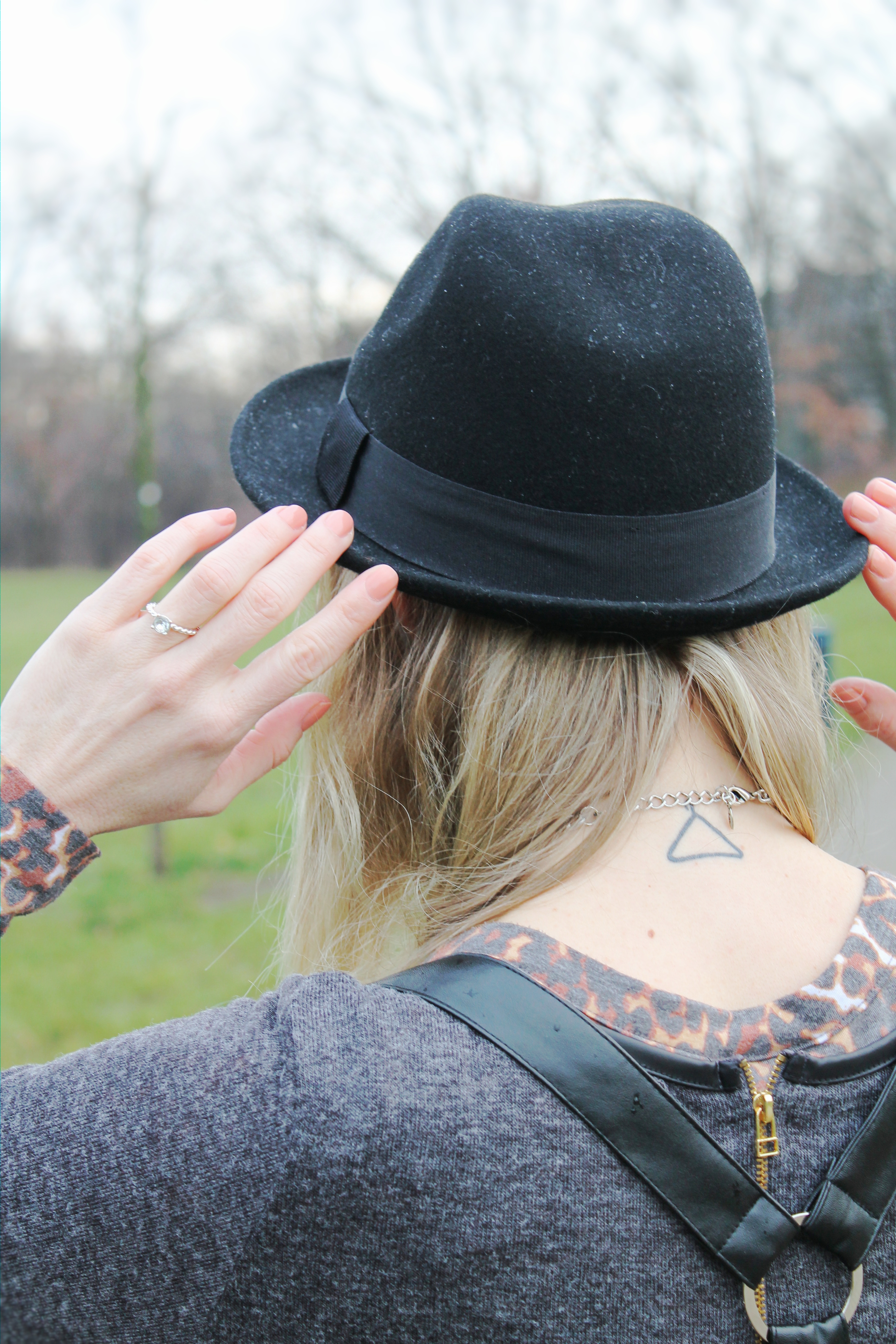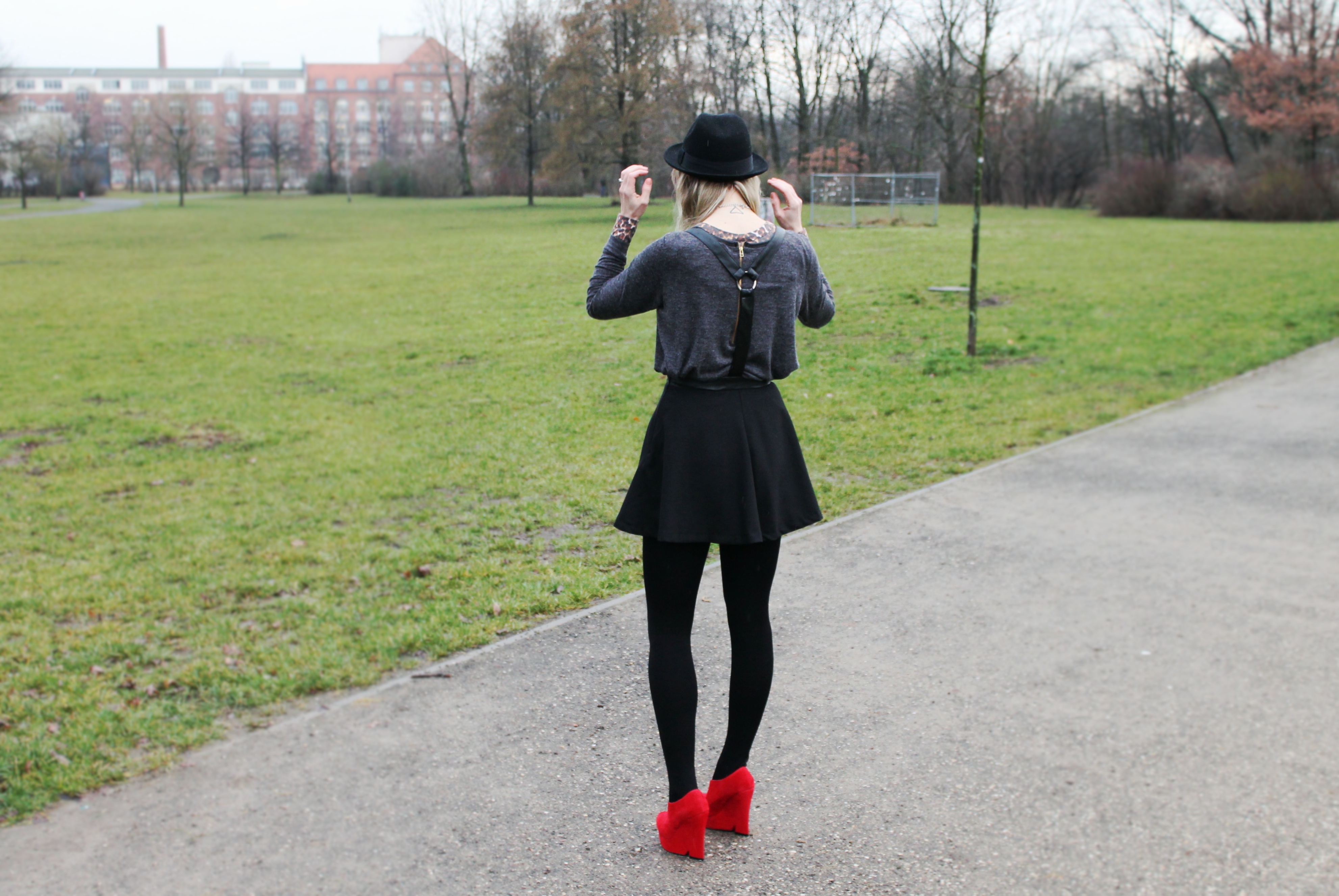 Pünktlich zum Outfitshooting fing es gestern Mittag in Berlin Kreuzberg an zu regnen. Auf dem Bild ganz unten sieht man die kleinen Regentropfen auf meinem Hut. Es waren aber nur ein paar Tropfen, so dass es auf Grund der milden Temperaturen ein angenehmer fast schon Frühlingsregen war. Ich trage meinen neuen Rock aus einer meiner Lieblingsgeschäfte ‚Broke+Schön Shop‚ (aktuell gibt es leider noch keinen Online-Shop). Es gab schon öfter Outfitposts mit Kleidungsstücken aus diesem wunderbaren Shop. Es gibt ihn zweimal in Berlin, einmal in Mitte und einmal in Friedrichshain. Am Wochenende gehe ich oft durch Friedrichshain spazieren, meistens sonntags um auf den Flohmarkt am Boxhagener Platz zu gelangen. Grundsätzlich drücke ich dann meine Nase an dem ‚Broke+Schön‘ Schaufenster platt, um die neuesten Teile zu entdecken. So trug es sich auch bei diesem Rock zu. Er hing im Schaufenster und sein Anblick traf mich wie ein Blitz. Ich konnte kaum einschlafen in der Nacht von Sonntag zu Montag, bis ich dann endlich zu ihm konnte und ihn als mein Eigentum ansehen durfte. Das traf sich ganz gut, denn so hatte ich mein Bühnenoutfit für den Auftritt mit meiner Band am vergangenen Wochenende zusammengestellt. Hier könnt ihr es anschauen. Passend zu diesem Rockstyle fand ich diesen Hut von H&M und meine allerliebsten red blood shoes. Sie wirken durch ihre extravagante Erscheinung etwas unbequem, durch die Plateausohle sind sie es aber nicht. Ich trug sie auch schon zu einem Bandfotoshooting hier. Dieses Shooting liegt schon etwas 1.5 jahre zurück, wie man an meinem komplett blondierten Haar unschwer erkennen kann, trotzdem haben diese Schuhe einen besonderen Platz in meiner Schuhsammlung und hin und wieder kommen sie zum Einsatz.