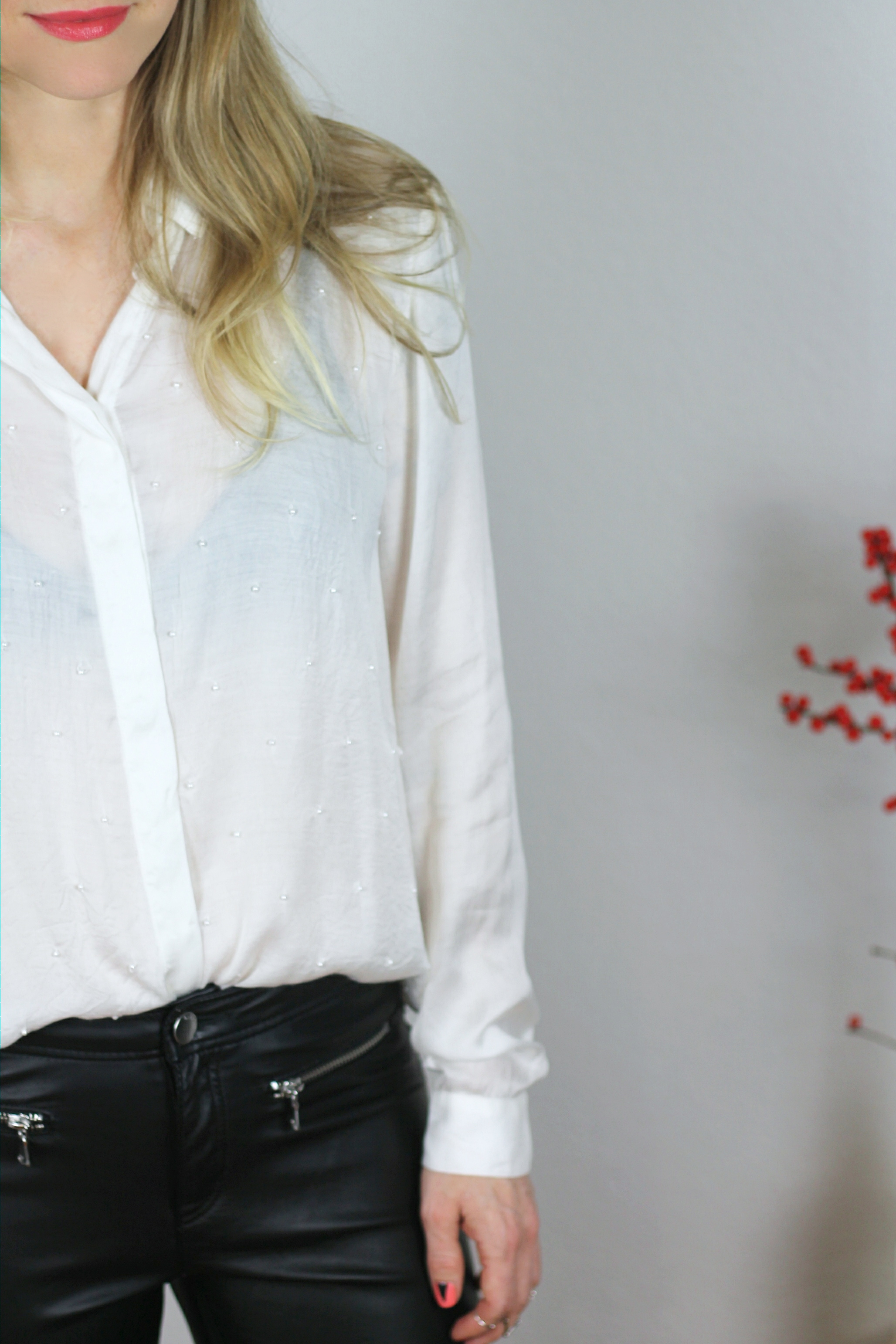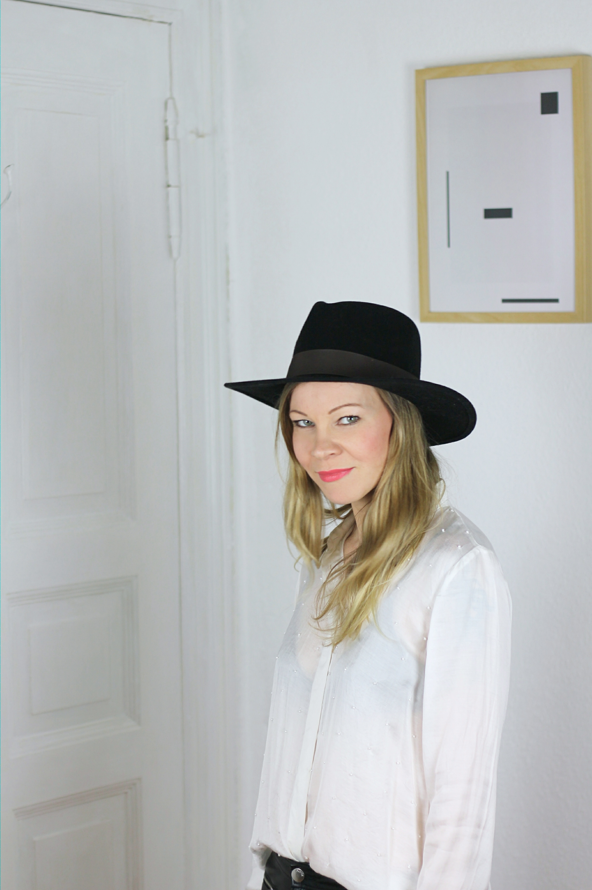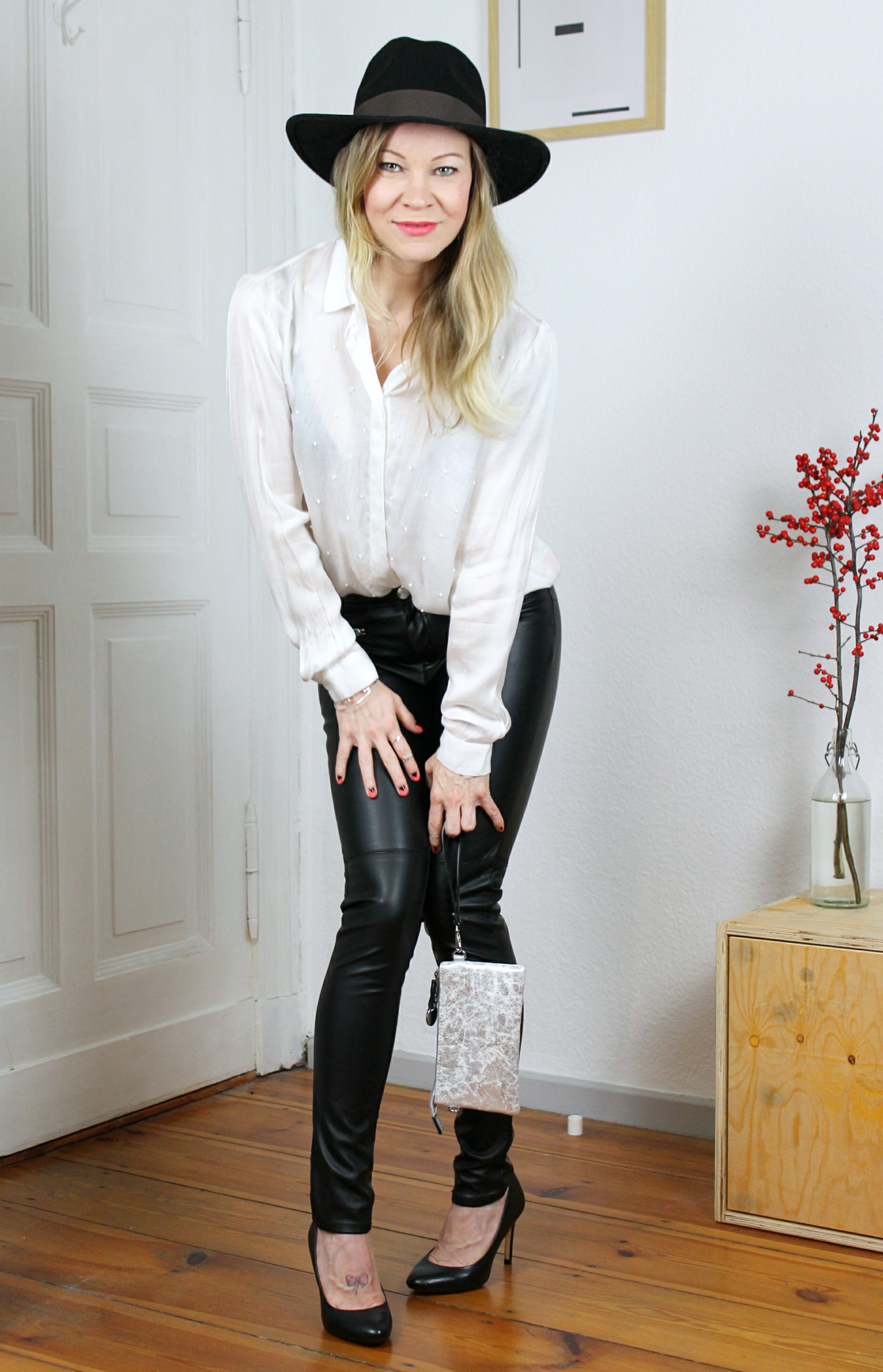 Gewählt habe ich eine fake Lederhose und eine leicht transparente Bluse. Zu diesem Anlass kann es auch ruhig mal ein Schuhwerk mit Absatz sein. Für den charmanten Schliff sorgt der Hut. Egal ob für die Homeparty zu Hause mit Freunden oder auch zum Tanzen in einem Club- diese Kombination ist passend für beide Partyvarianten.