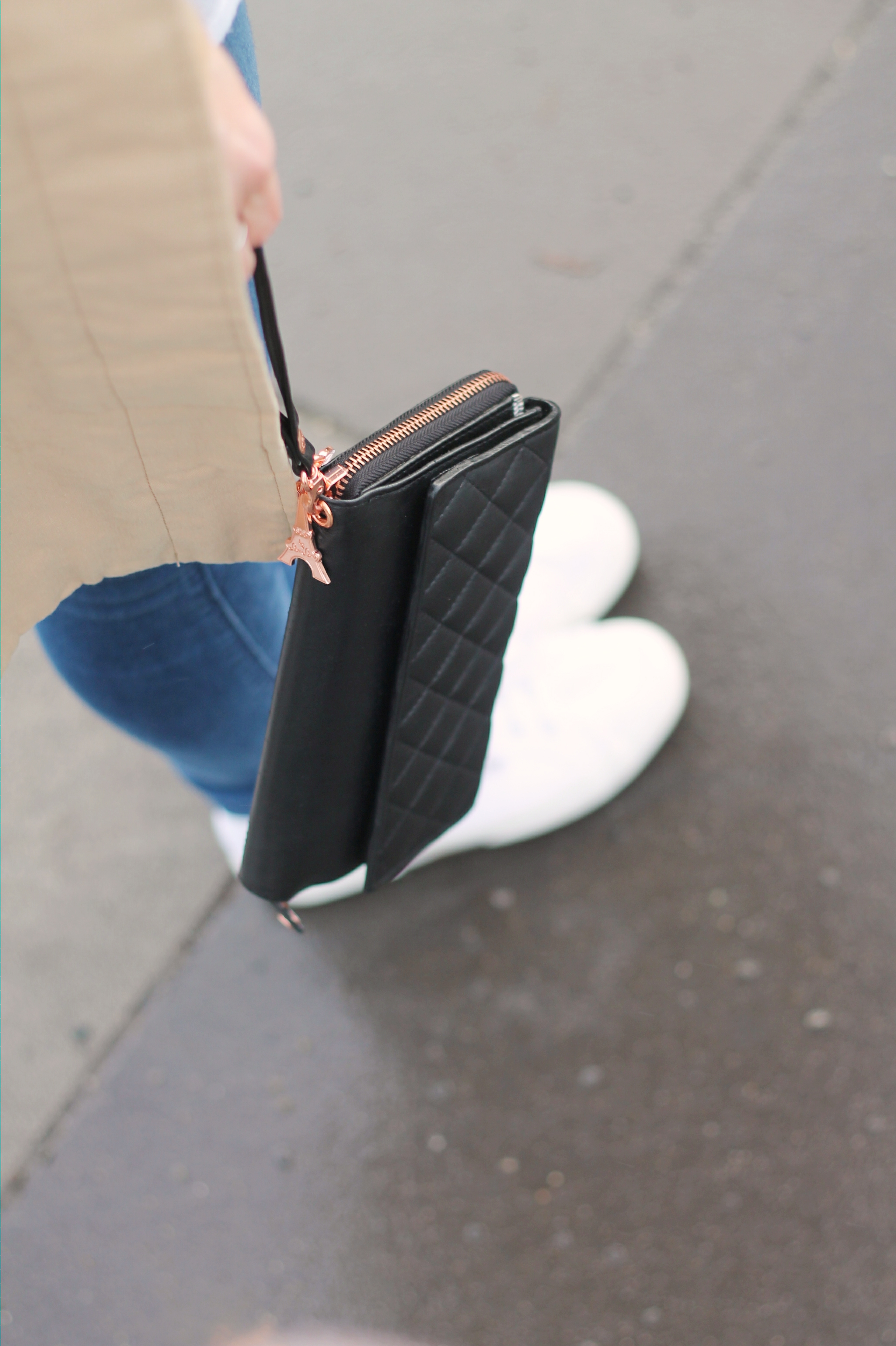 trenchcoat and white sneakers