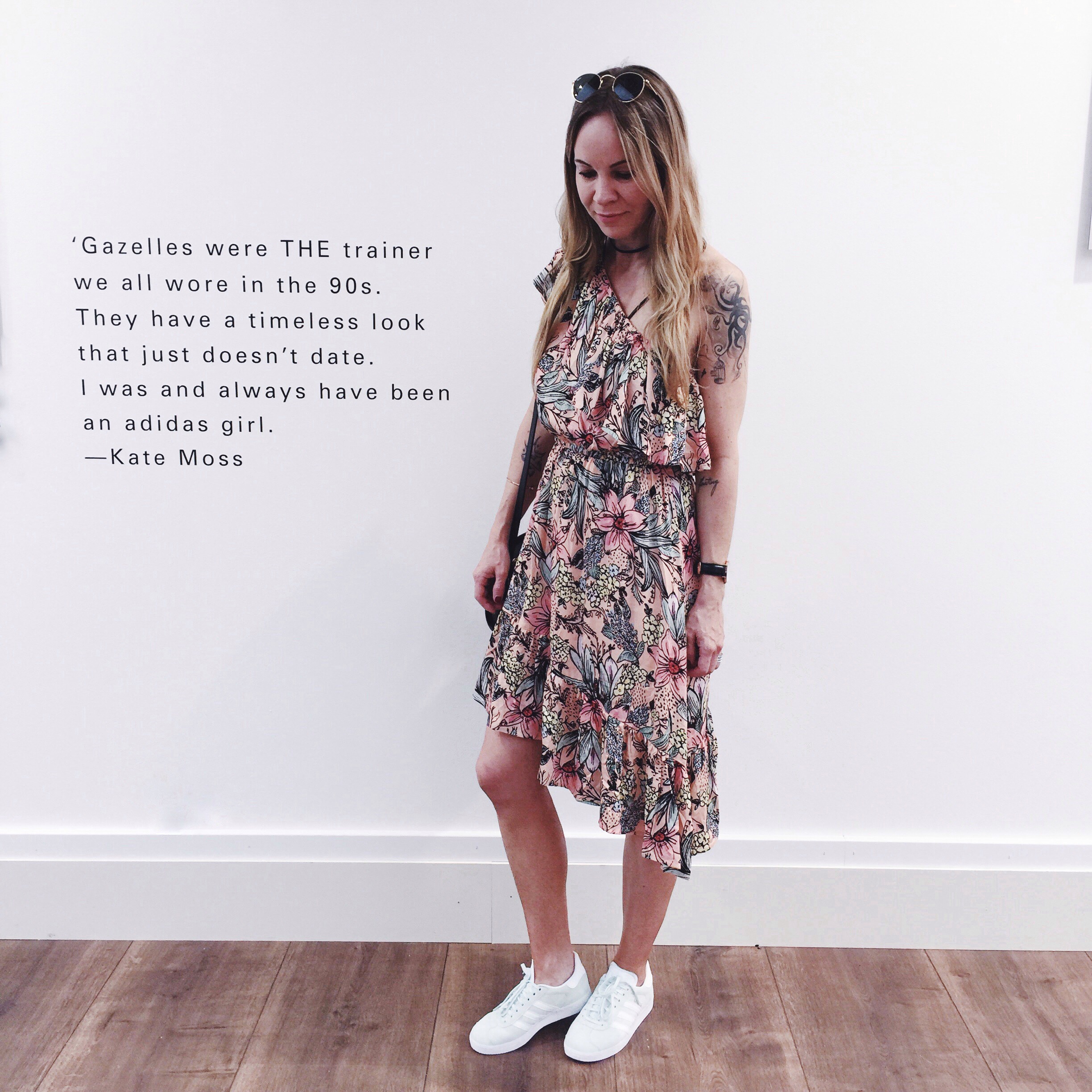 At the ‚Adidas‘ Gazelle Backyard Gallery. Wearing Adidas Gazelle Sneakers and ‚Minkpink‘ dress.