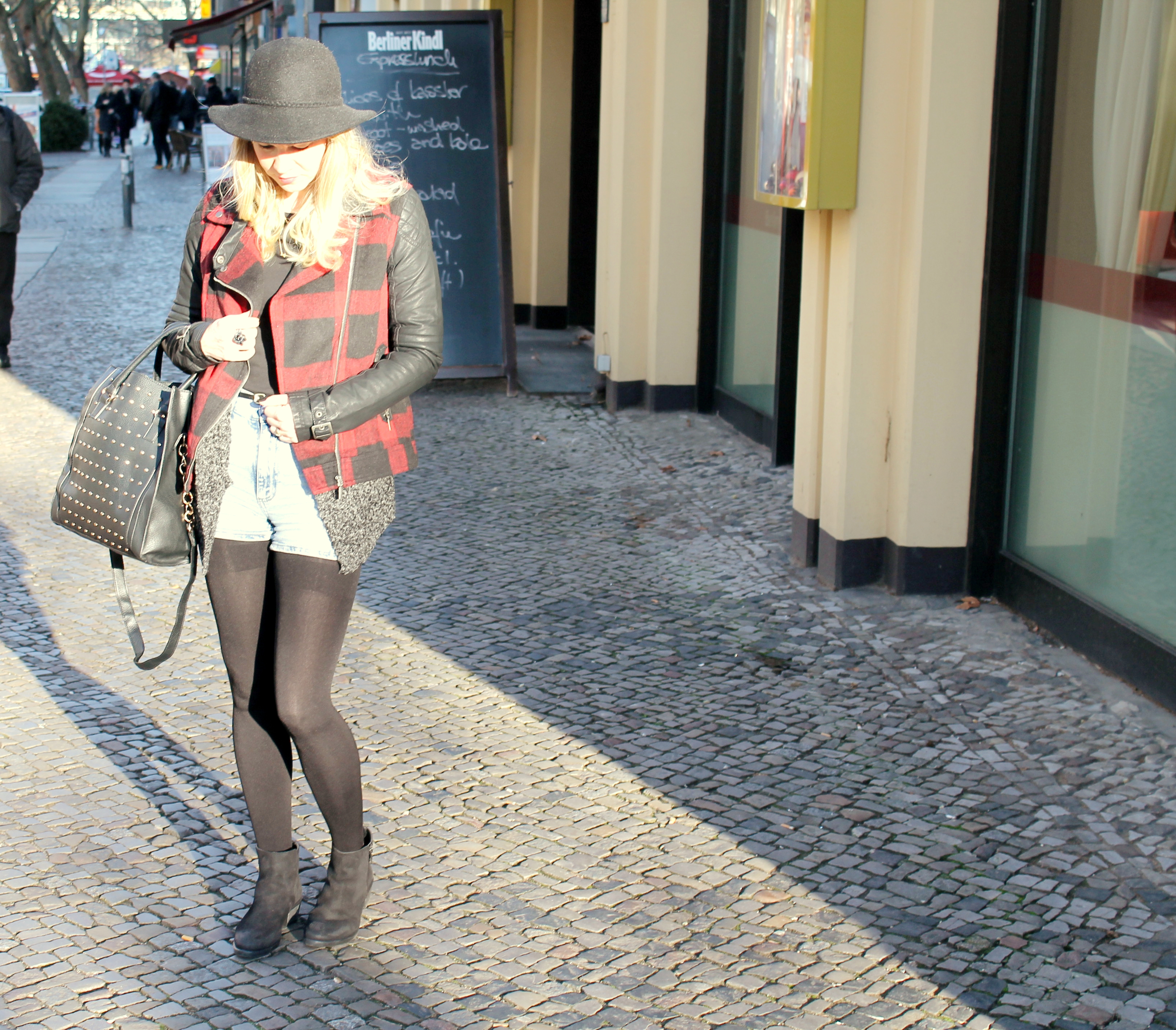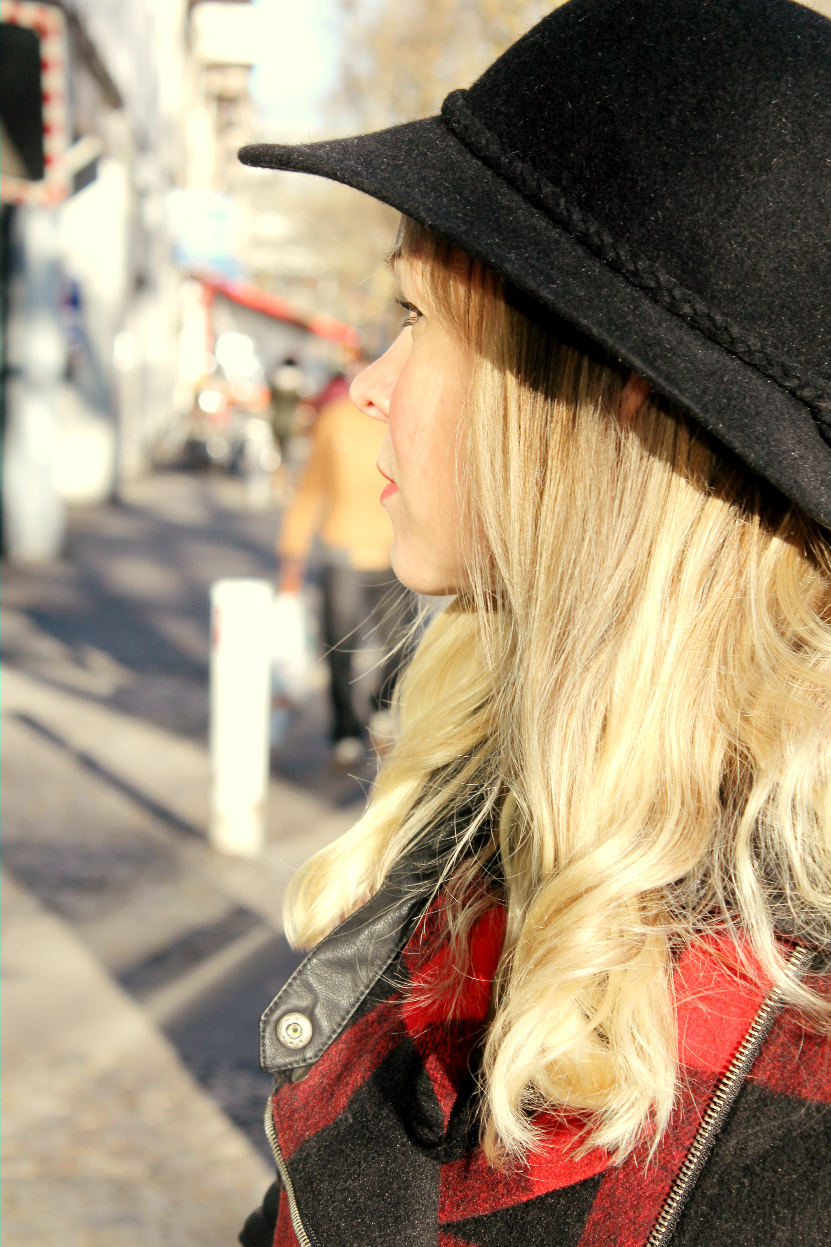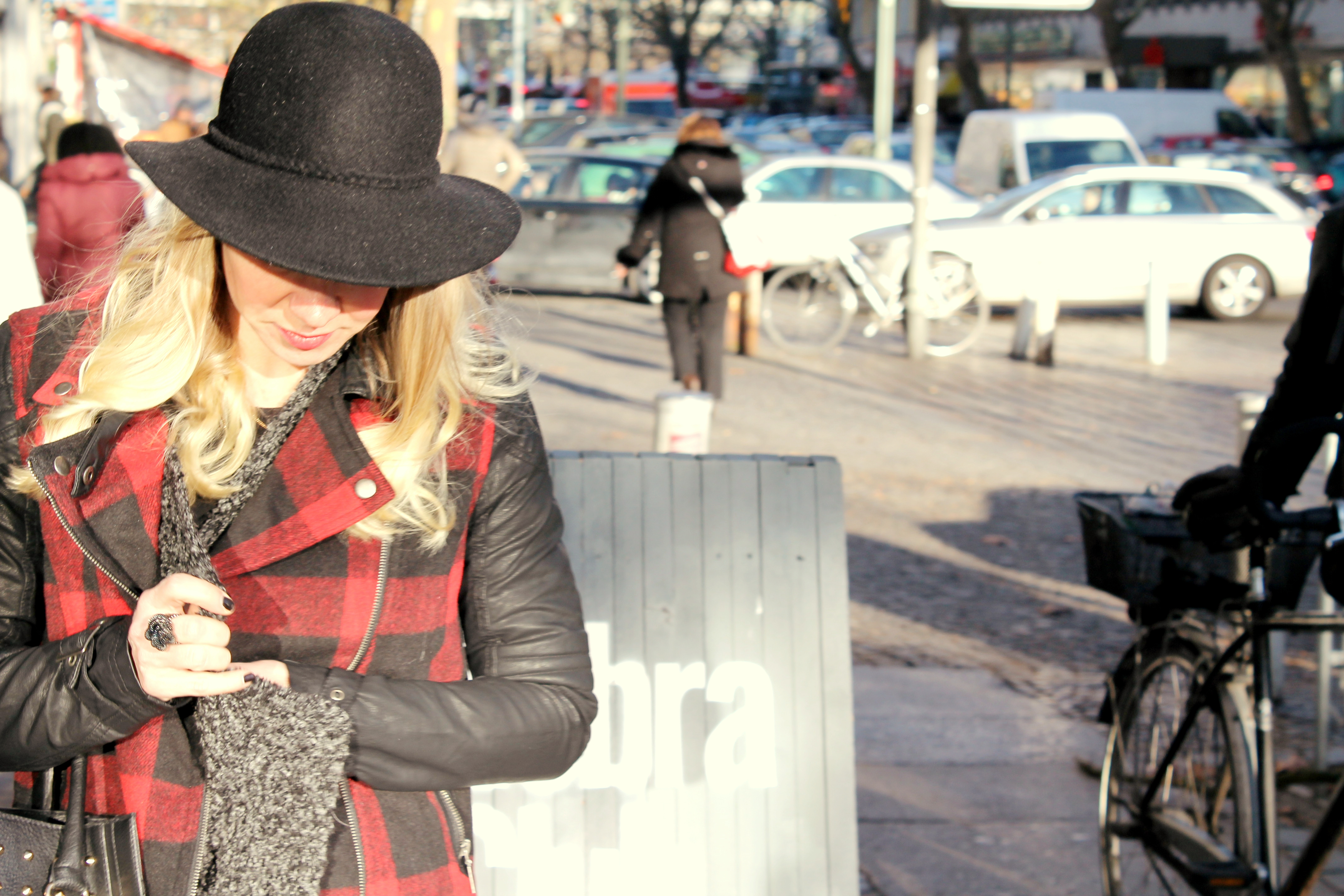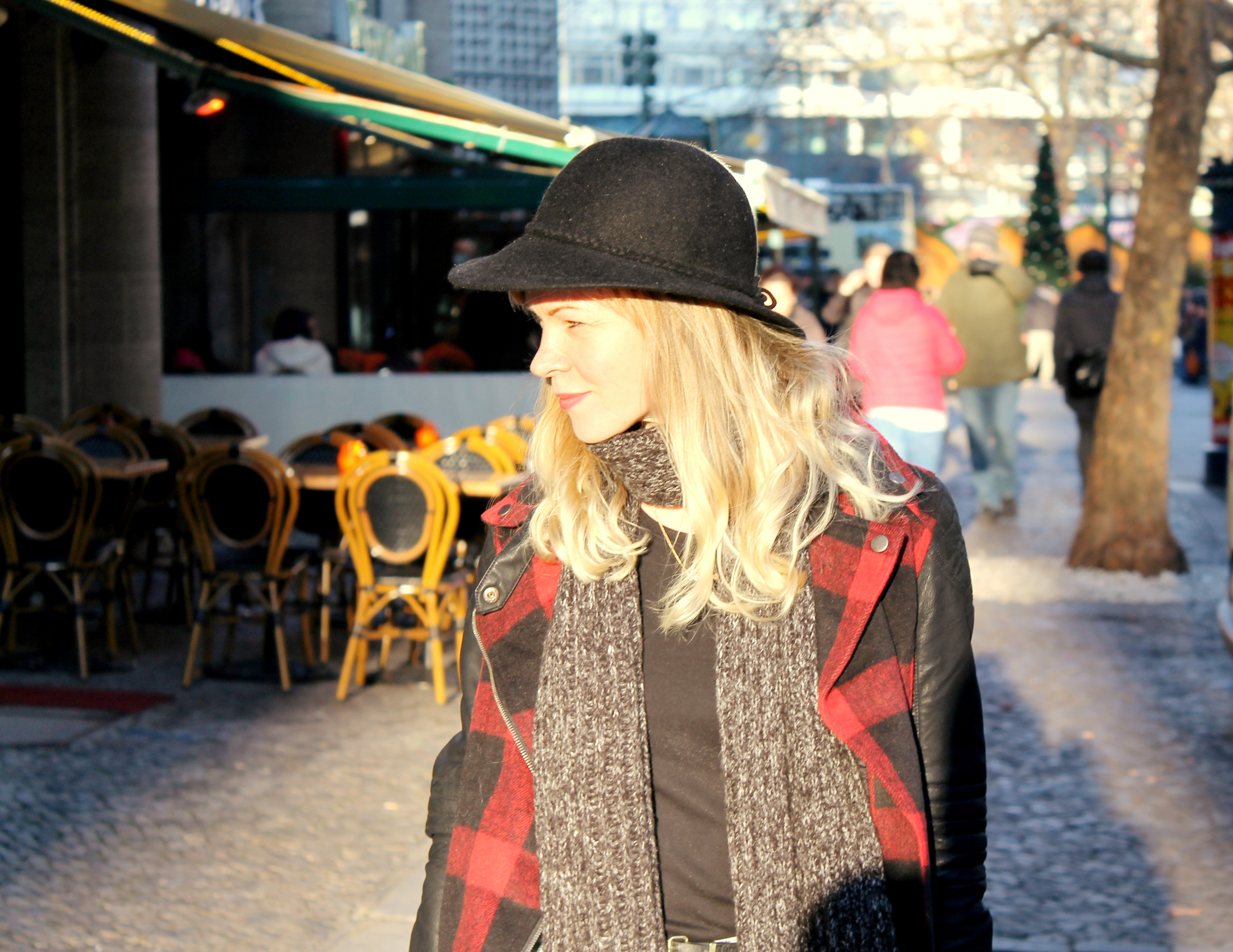 Pünktlich zum Outfitshooting fing es gestern Mittag in Berlin Kreuzberg an zu regnen. Auf dem Bild ganz unten sieht man die kleinen Regentropfen auf meinem Hut. Es waren aber nur ein paar Tropfen, so dass es auf Grund der milden Temperaturen ein angenehmer fast schon Frühlingsregen war. Ich trage meinen neuen Rock aus einer meiner Lieblingsgeschäfte ‚Broke+Schön Shop‚ (aktuell gibt es leider noch keinen Online-Shop). Es gab schon öfter Outfitposts mit Kleidungsstücken aus diesem wunderbaren Shop. Es gibt ihn zweimal in Berlin, einmal in Mitte und einmal in Friedrichshain. Am Wochenende gehe ich oft durch Friedrichshain spazieren, meistens sonntags um auf den Flohmarkt am Boxhagener Platz zu gelangen. Grundsätzlich drücke ich dann meine Nase an dem ‚Broke+Schön‘ Schaufenster platt, um die neuesten Teile zu entdecken. So trug es sich auch bei diesem Rock zu. Er hing im Schaufenster und sein Anblick traf mich wie ein Blitz. Ich konnte kaum einschlafen in der Nacht von Sonntag zu Montag, bis ich dann endlich zu ihm konnte und ihn als mein Eigentum ansehen durfte. Das traf sich ganz gut, denn so hatte ich mein Bühnenoutfit für den Auftritt mit meiner Band am vergangenen Wochenende zusammengestellt. Hier könnt ihr es anschauen. Passend zu diesem Rockstyle fand ich diesen Hut von H&M und meine allerliebsten red blood shoes. Sie wirken durch ihre extravagante Erscheinung etwas unbequem, durch die Plateausohle sind sie es aber nicht. Ich trug sie auch schon zu einem Bandfotoshooting hier. Dieses Shooting liegt schon etwas 1.5 jahre zurück, wie man an meinem komplett blondierten Haar unschwer erkennen kann, trotzdem haben diese Schuhe einen besonderen Platz in meiner Schuhsammlung und hin und wieder kommen sie zum Einsatz.