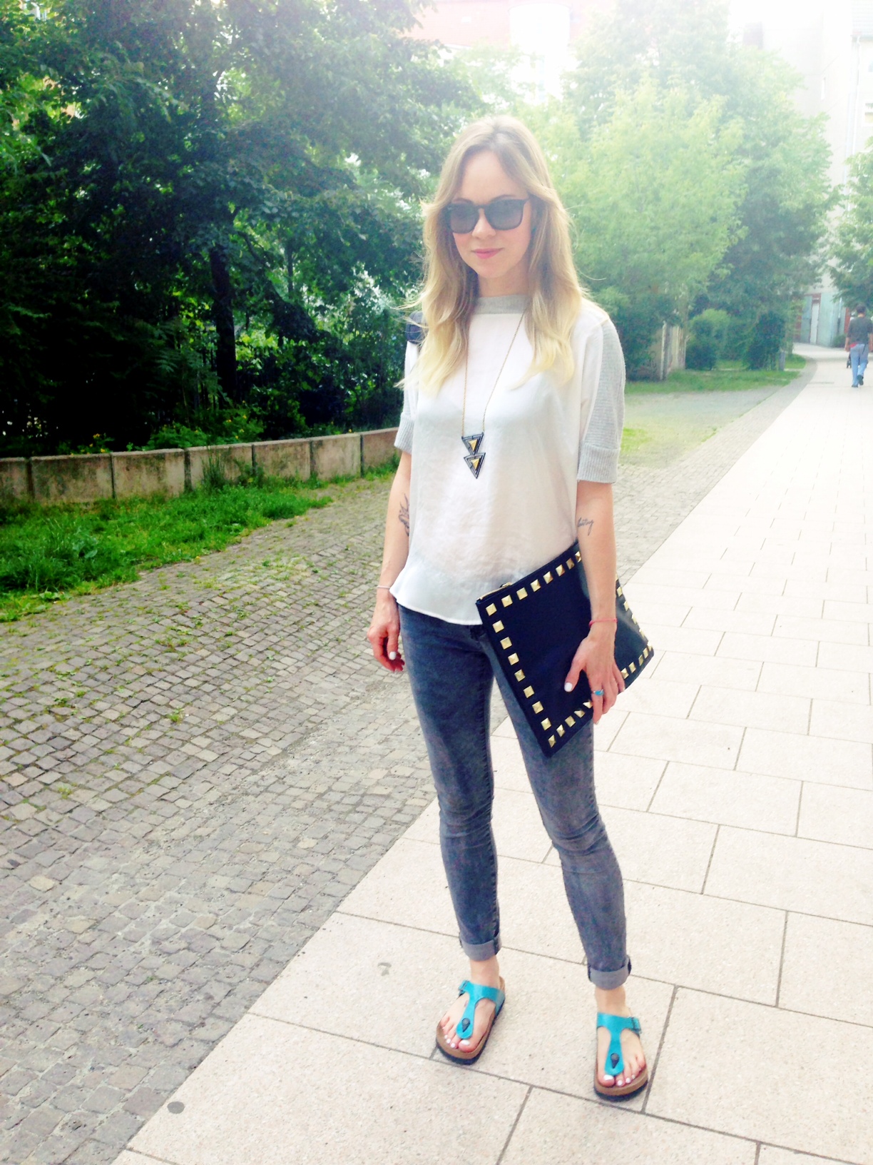 The question ‚What should I wear?‘ was on my mind as always and so I decided for a classic, sporty and elegant look. It was a very sunny and warm day, so I could get my turquoise Birkenstock shoes for the first time this year out of the closet. This season Birkenstock’s seems to be establish as a ‚fashion must-have‘. I’ve 2 pair since last year in my collection but I am considering to buy a third pair :-).