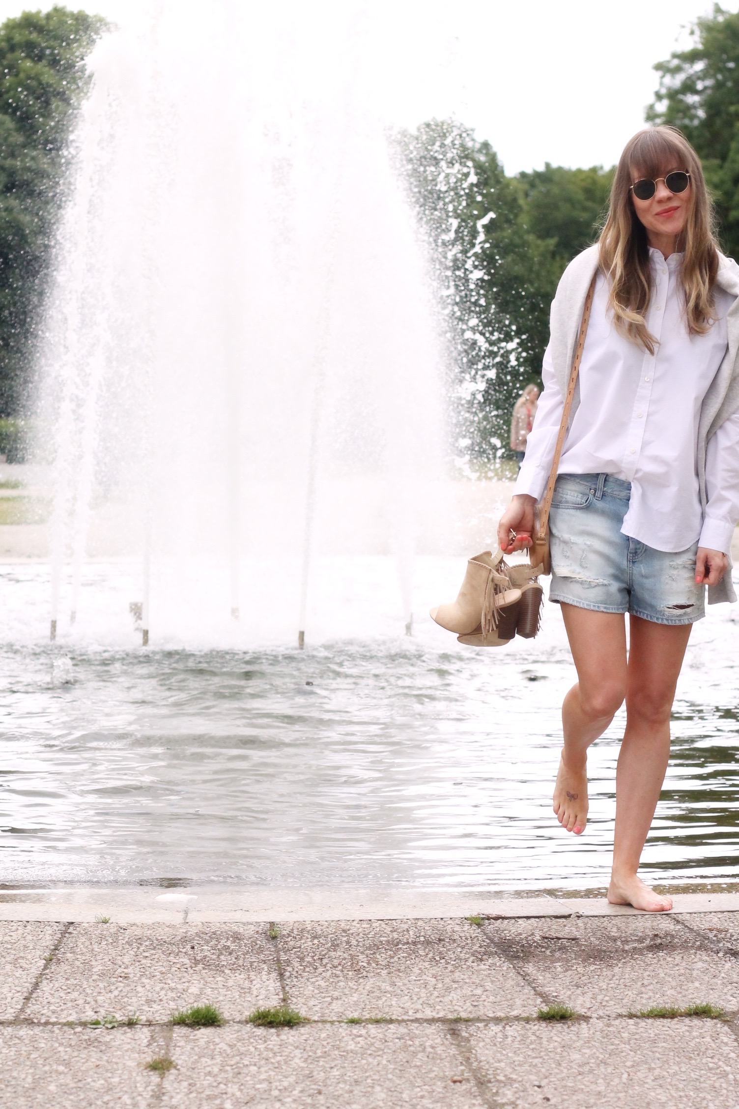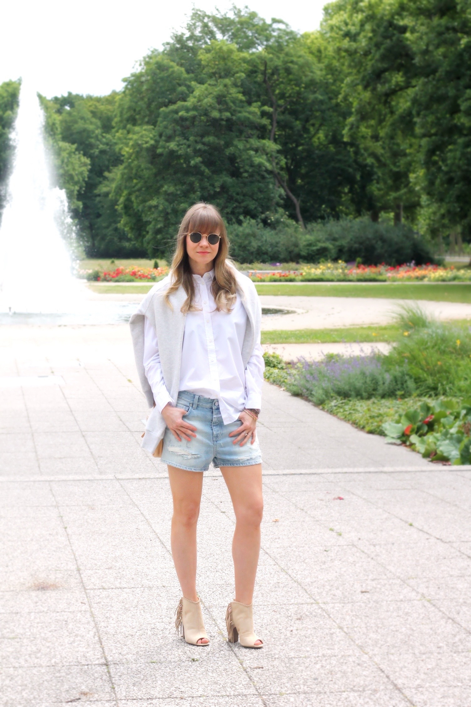Last Sunday we were able to catch some sunshine in between all the rain and bad temperatures, while walking through the beautiful Treptower Park. I’m wearing the perfect white blouse with a nice oversized cut and the all time must-have piece for summer: the perfect denim shorts. I hope you like the look. XX Ina