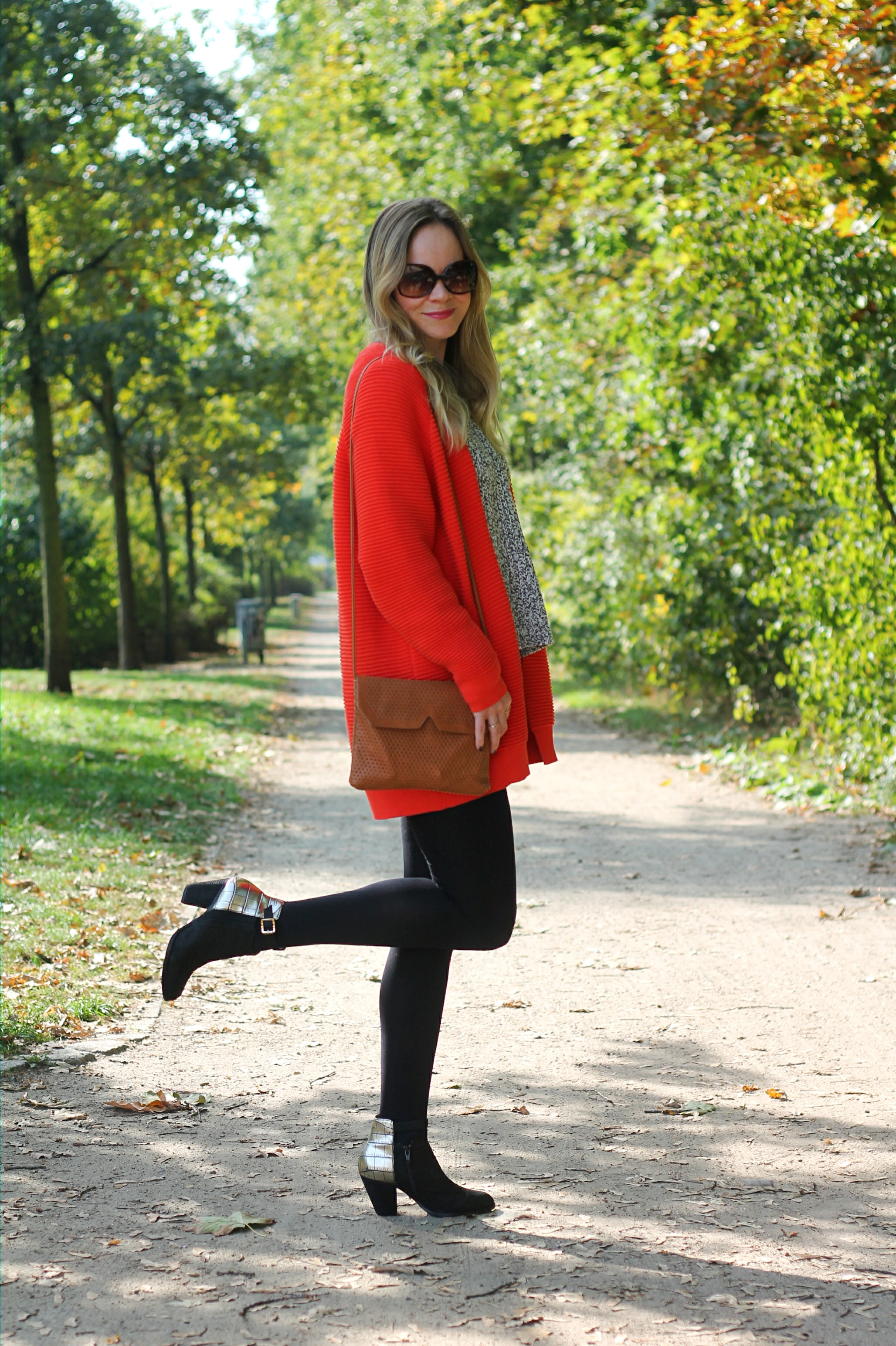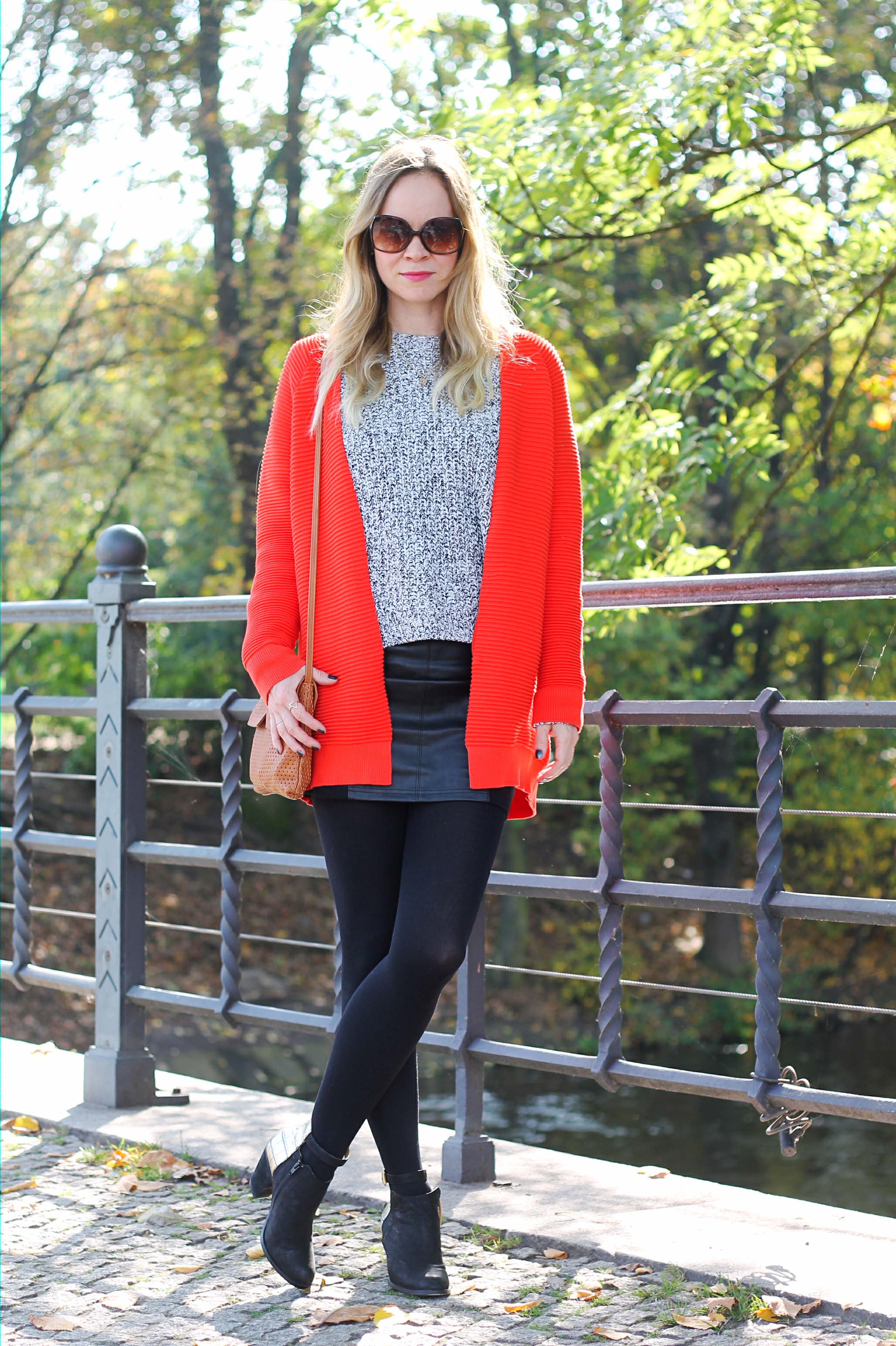 Neulich war ich zufällig bei ‚Pull & Bear‘ in der Tauentzienstraße – Berlin Charlottenburg und war begeistert von dem Angebot (Online-Shop hier). Der orange-rote Cardigan und die kleine Tasche wanderten mit. Ich finde Cardigans kann man nicht genug haben im Herbst und ein farbenfrohes Stück fehlte noch in meinem Kleiderschrank. Dazu kombiniert habe ich einen Stoff- Kunstleder-Minirock und meine Lieblingsstiefelletten von Buffalo. Ich hoffe Euch gefällt der Look und wünsche Euch einen fröhlich herbstlichen Wochenstart.
