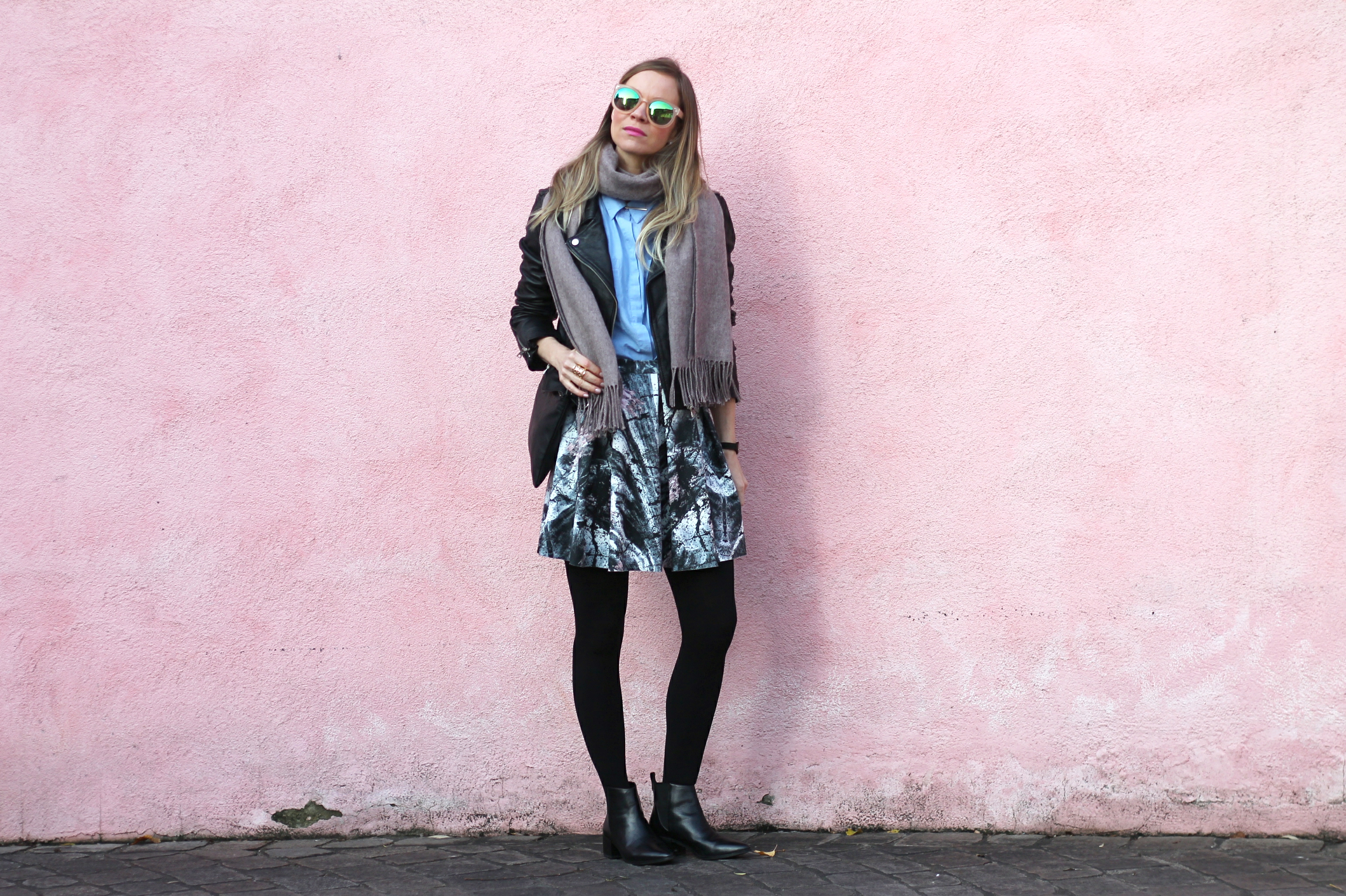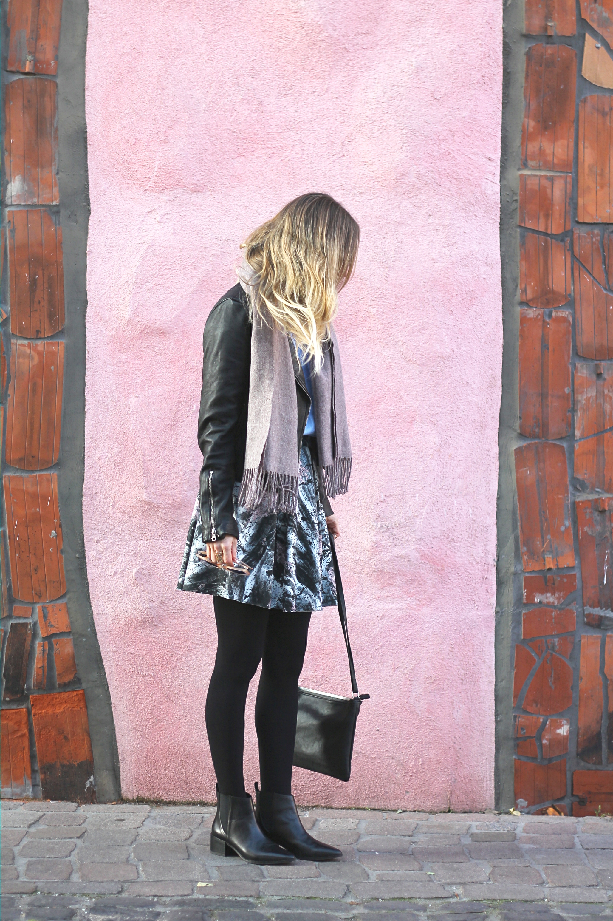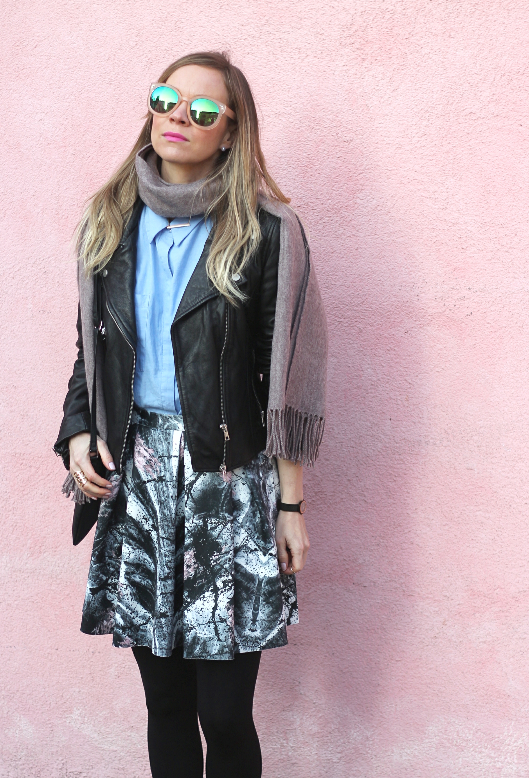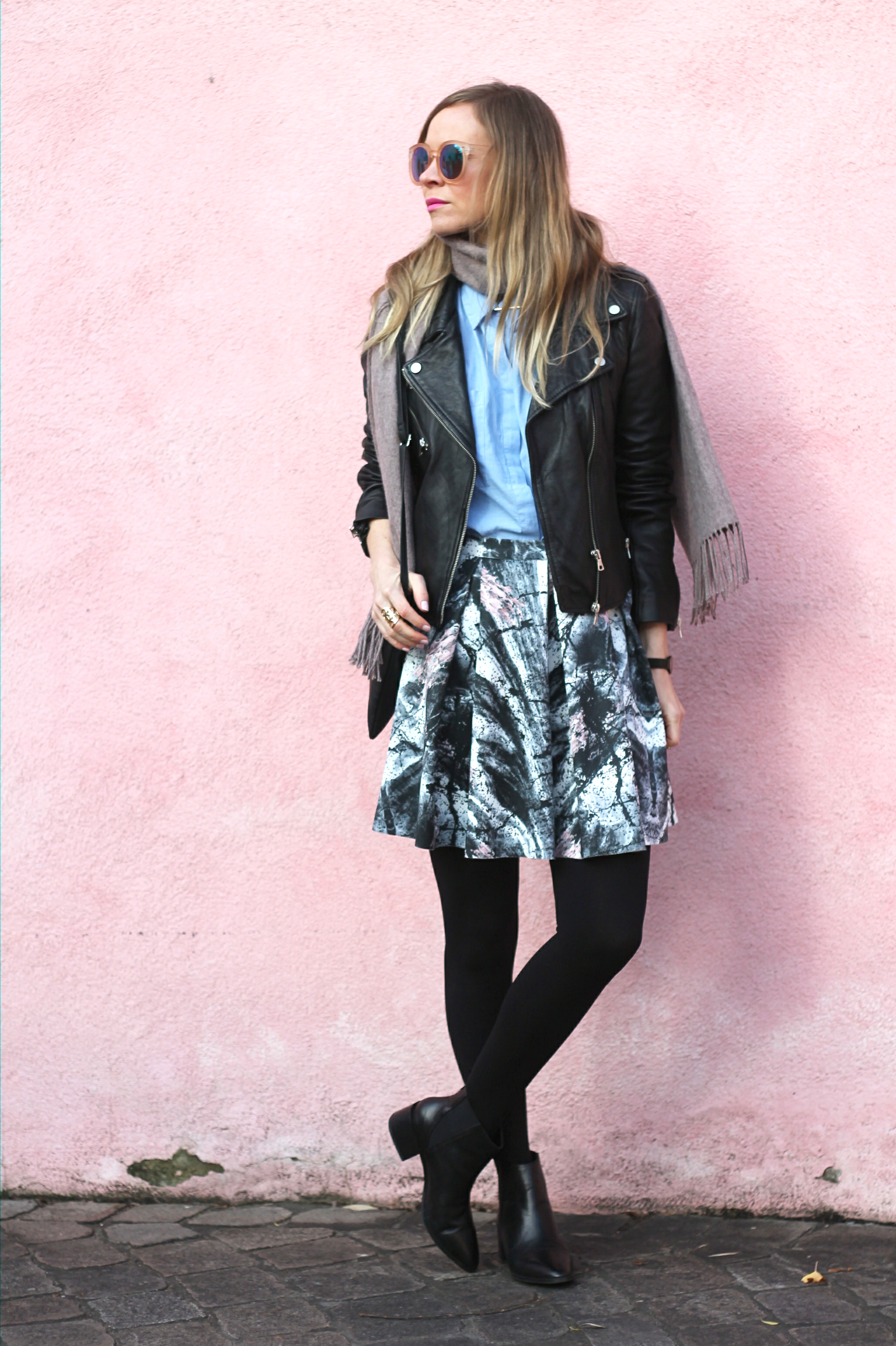 Obwohl die Temperaturen, besonders in den Morgenstunden derzeit an den Winter zurück erinnern und der Frühling anscheinend doch noch etwas auf sich warten lässt, trotze ich dem ganzen Wetter-rauf-und-runter entgegen und hauche dem kühlen Grau mit meinem heutigen Outfit etwas Farbe ein. Ich bin total verliebt in meinen neuen Jeansrock in A-Form. Ich freue mich schon so auf den Sommer, wenn ich dieses schöne Teil auch ohne Strumpfhose mit ein paar leichten Sandalen oder Espadrilles tragen kann. Diesmal trage ich meine leichte Jacke von Modström. Ich mag das Muster und die Farbkombination dieser Jacke sehr. Ich hoffe es gefällt euch und wünsche Euch ein schönes Osterfest. XX Ina