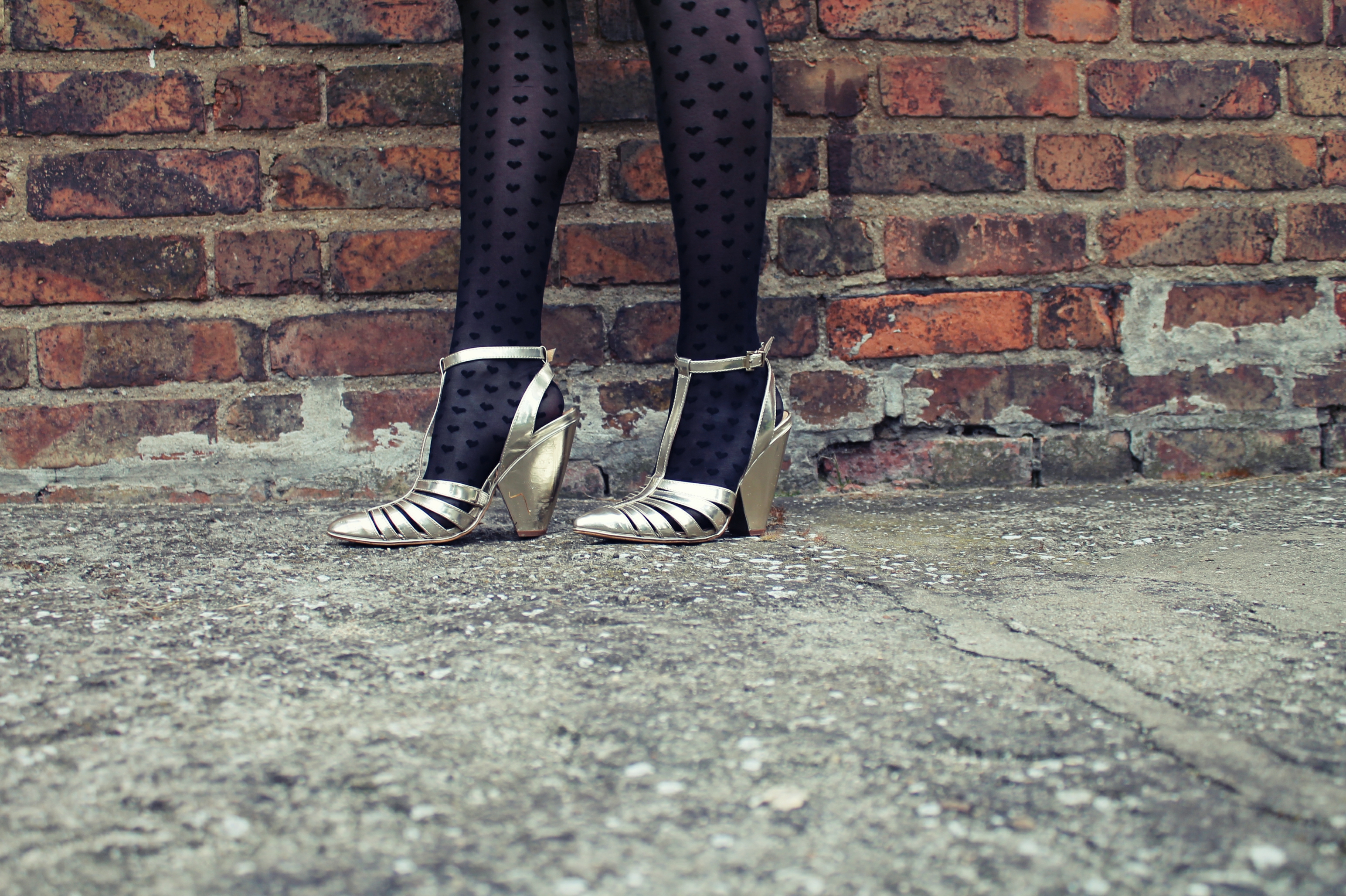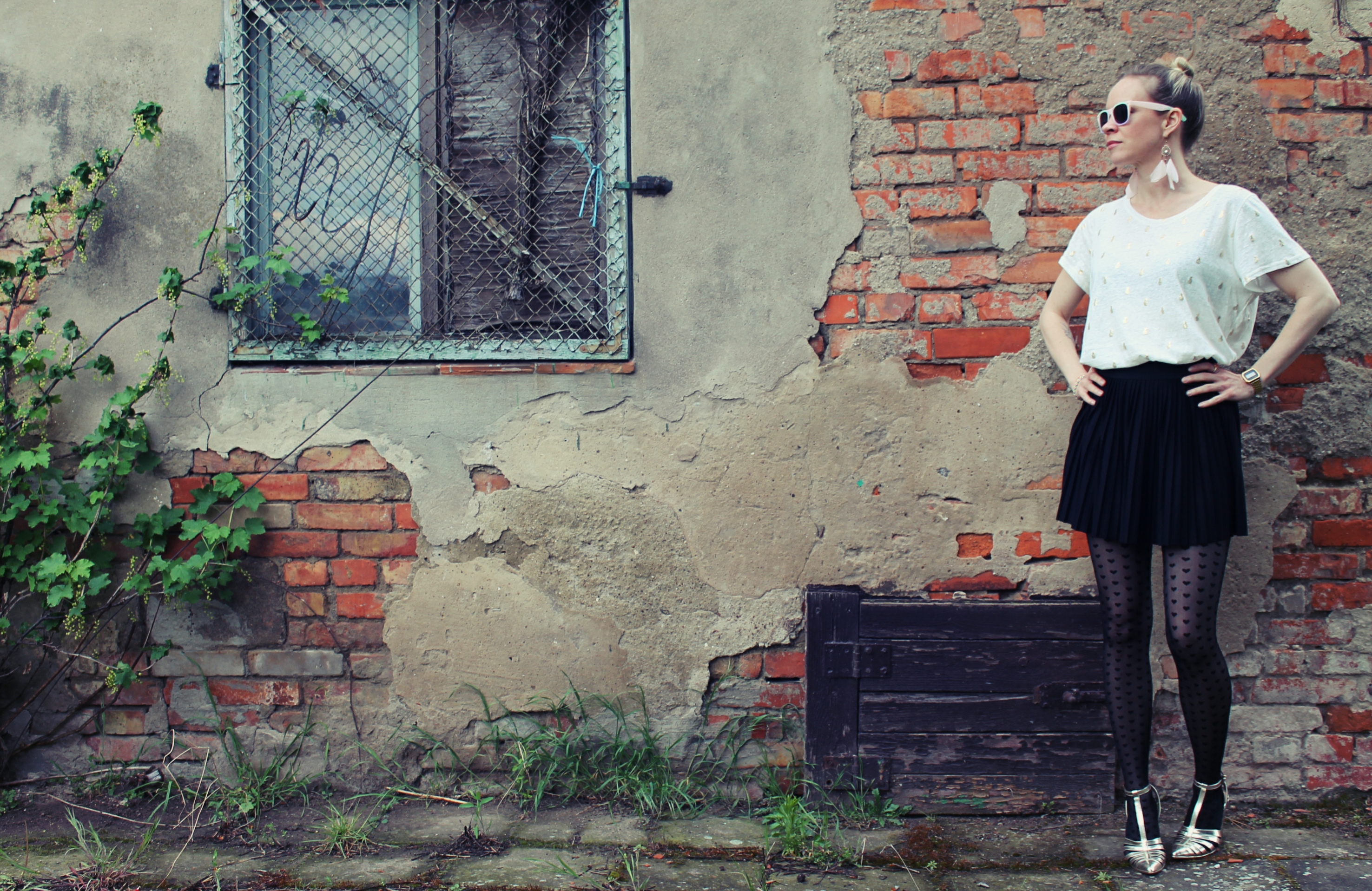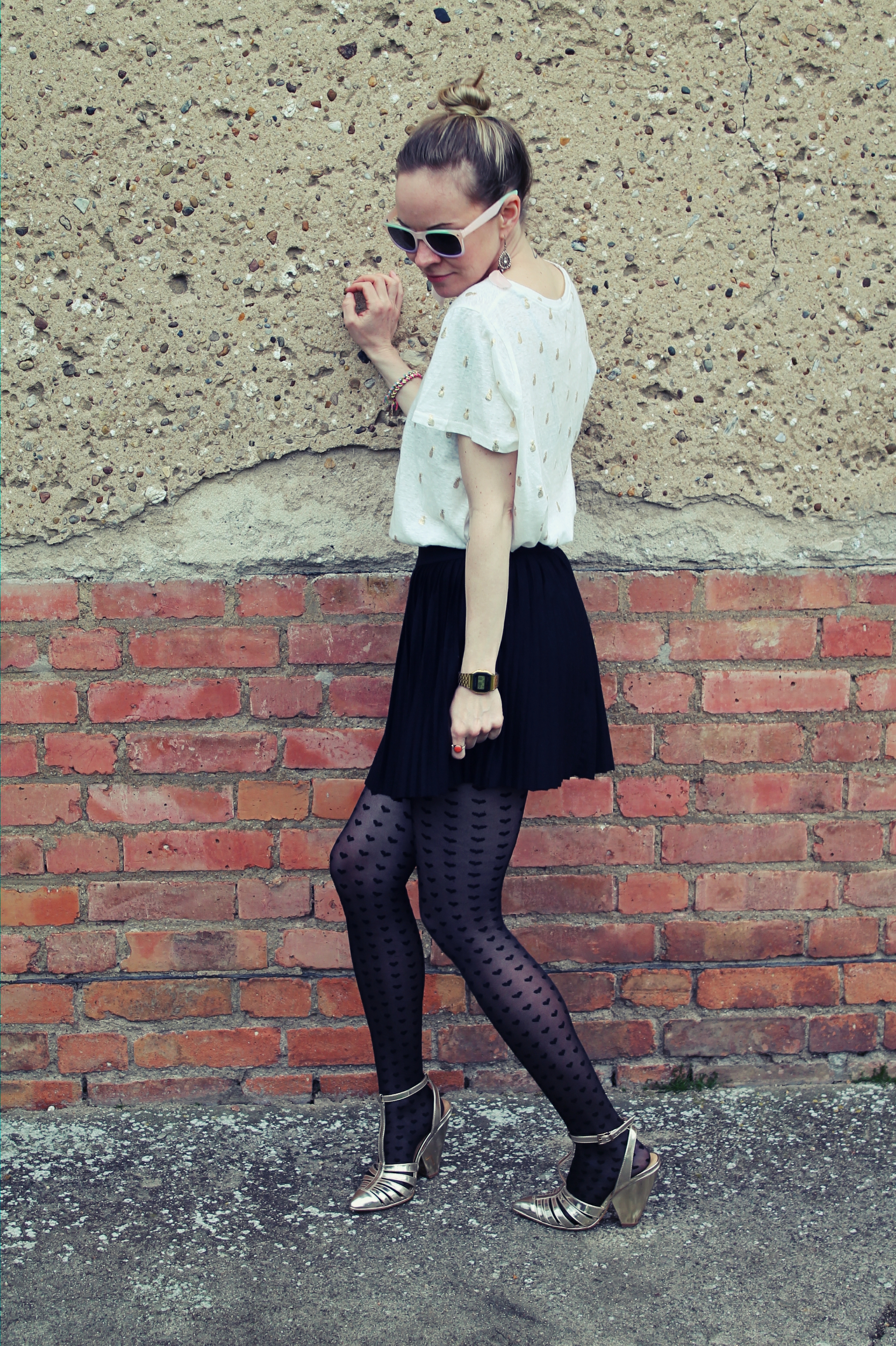 Spring temperatures finally allowed me to wear my golden shoes, which I bought some time ago on the blogger bazaar in Berlin from ‚Les Berlinettes‘. I wear my new pineapple-shirt which I saw at ‚Broke + Schön‘ and I fell in love immediately. That figures 🙂 ! The black pleated skirt isn’t a new one. I wear it more often because it fits well and it can also be combined very well. I hope you like it. xx Ina
