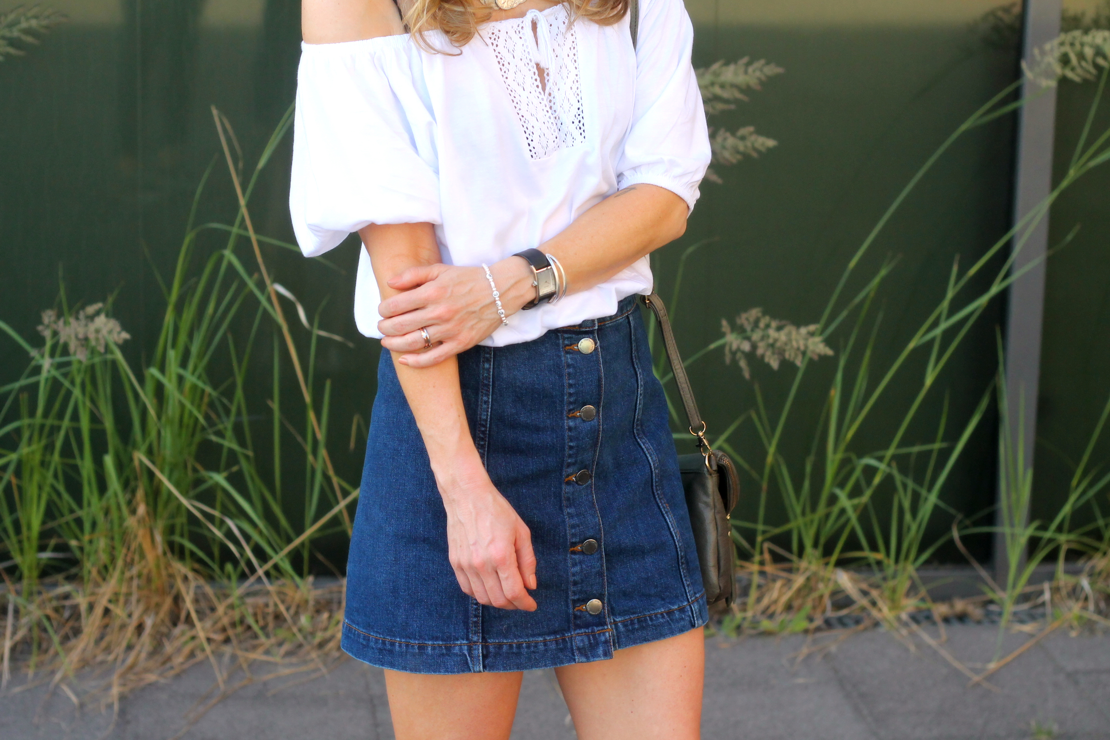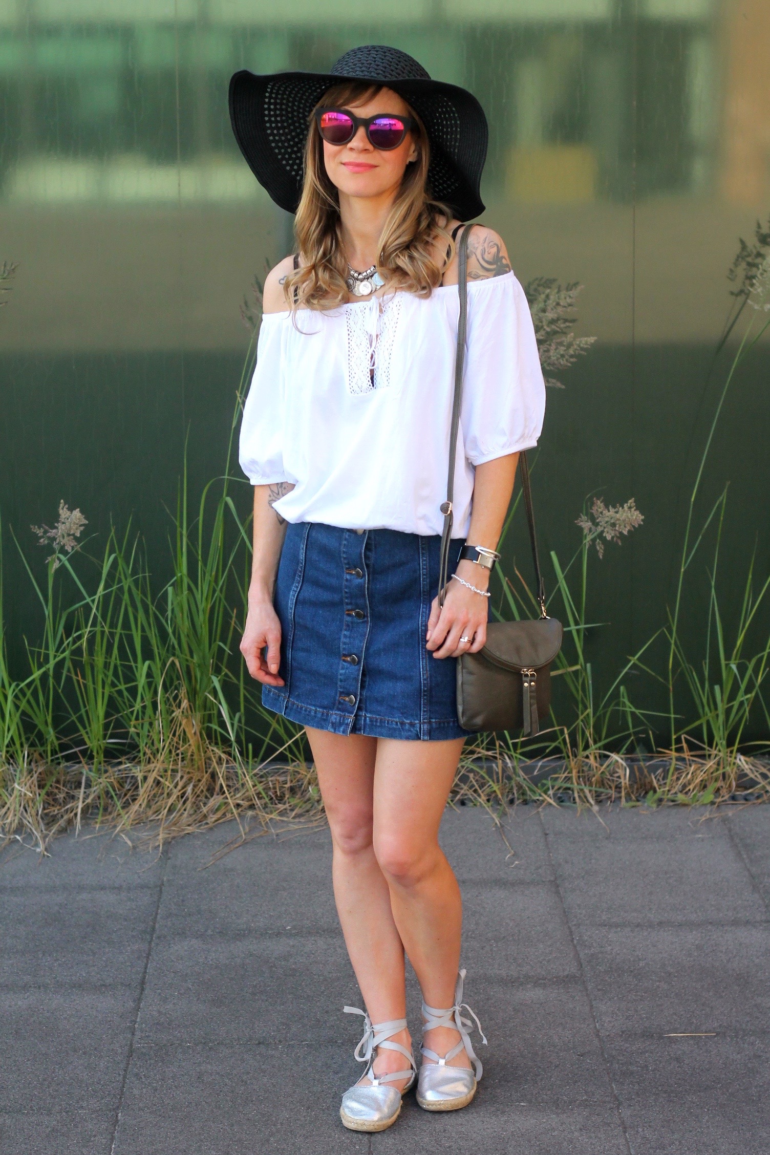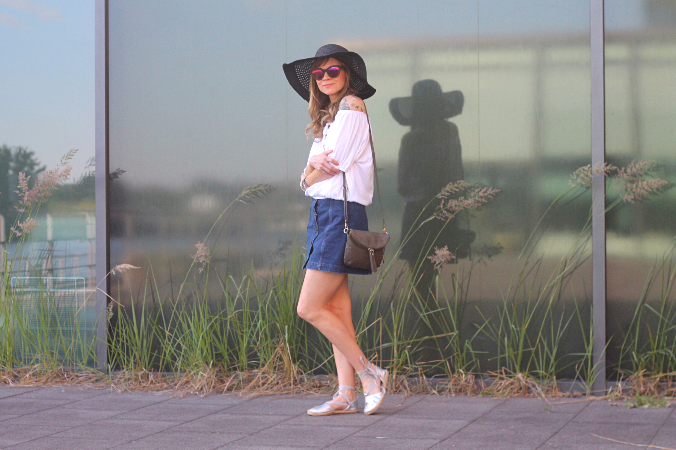 Sommer, Sonne, Hitzewelle- passend zum Wetter gibt es eine Outfitinspiration für Euch. Ich trage einen Jeansrock von Topshop in A-Form, zu dem man sehr viel kombinieren kann. Zum Beispiel ein casual sweater und passend dazu ein paar Vans oder auch etwas eleganter ein cropped Top und dazu ein paar Absatzsandalen. Ich habe mich für den off-shoulder Trend entschieden. Kombiniert dazu habe ich ein paar verspielte Espadrilles, die ich mal vor geraumer Zeit bei H&M gekauft habe. Die pink verspiegelte Sonnenbrille sorgt für den nötigen Farbklecks und der Sommerhut rundet das Outfit ab. Ich hoffe Euch gefällt mein Sommerlook. XX Ina!