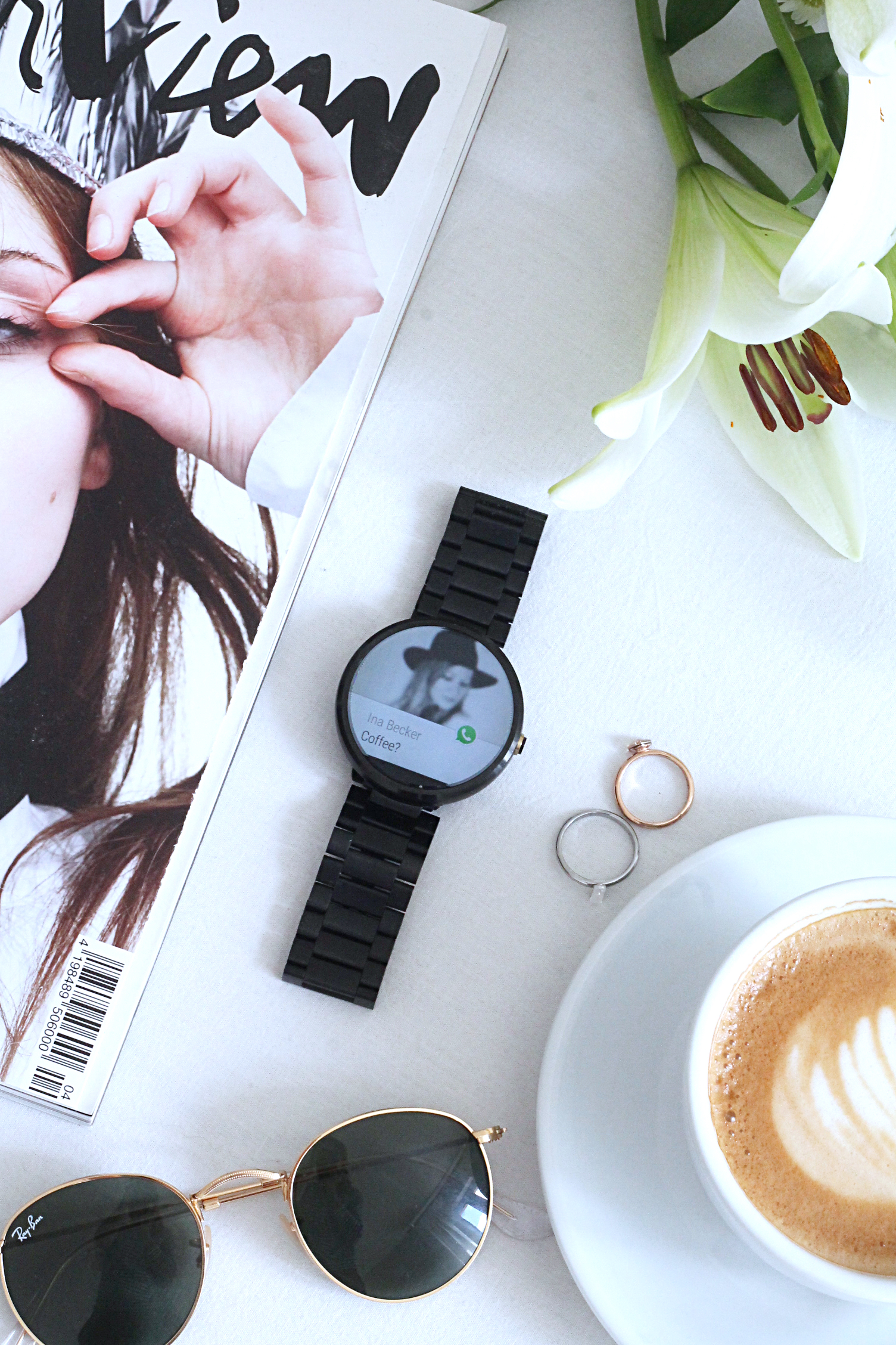 Today I want to introduce you to the moto 360 of ‚Motorola‘. The design of this smartwatch is very beautiful, classic and modern. But not only the design is a hit, the operation through the touch function is very practical. The watch allows me more easy to leave my phone in my pocket, because it is always associated with my Moto X and shows me all the important and new messages, blog posts (also Instagram), appointments, phone calls, directions and much more directly on my wrist. The watch has become a real enrichment for me for example when I ride my bike, I can always see the direction for example with Google Maps on my wrist without having the phone in my hand. Or while or when you go out to eat with friends, there’s no need to pick out your phone from your bag and you still knows what’s going on- it’s just great. You can quickly set the timer for the breakfast buns via voice command and create a quick note for the buying list, all this is not a problem for my moto 360.