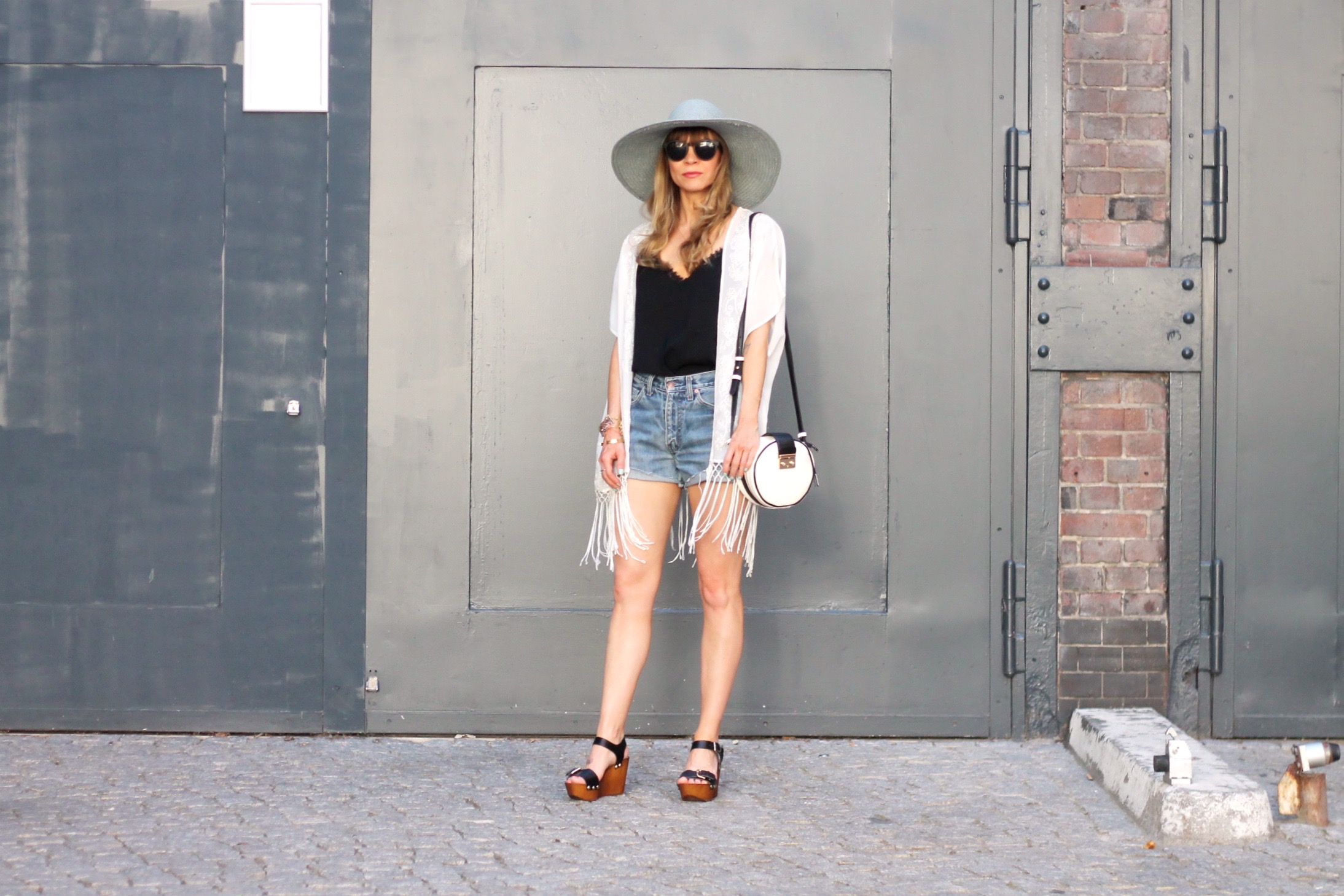 outfit on a hot sunny day: birks, poncho & jeans shorts.