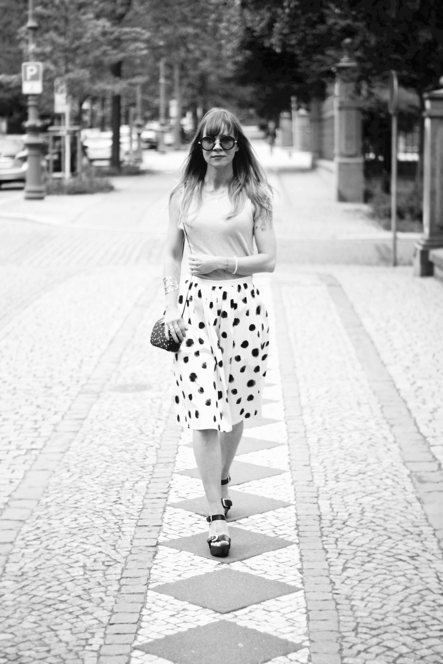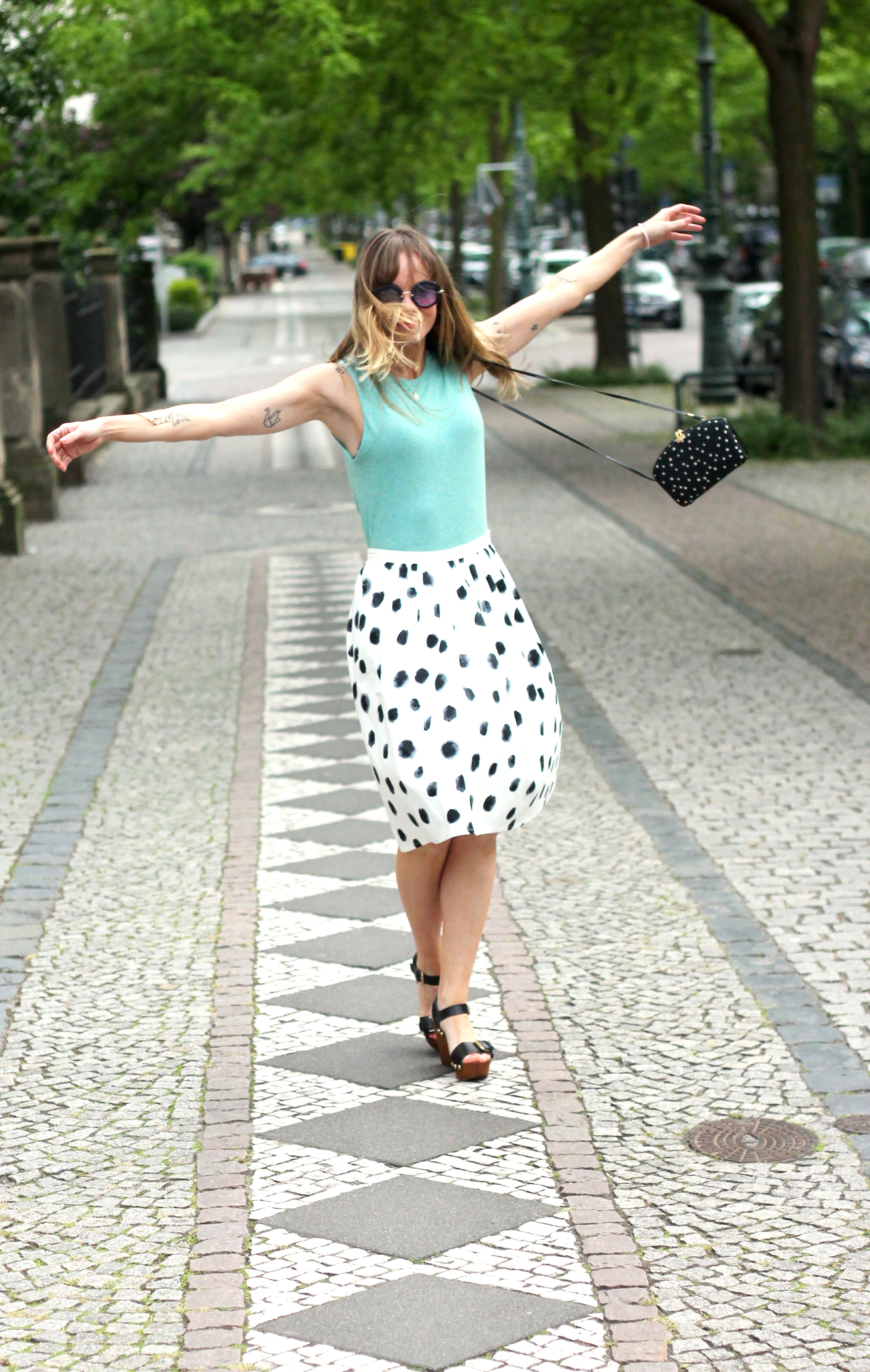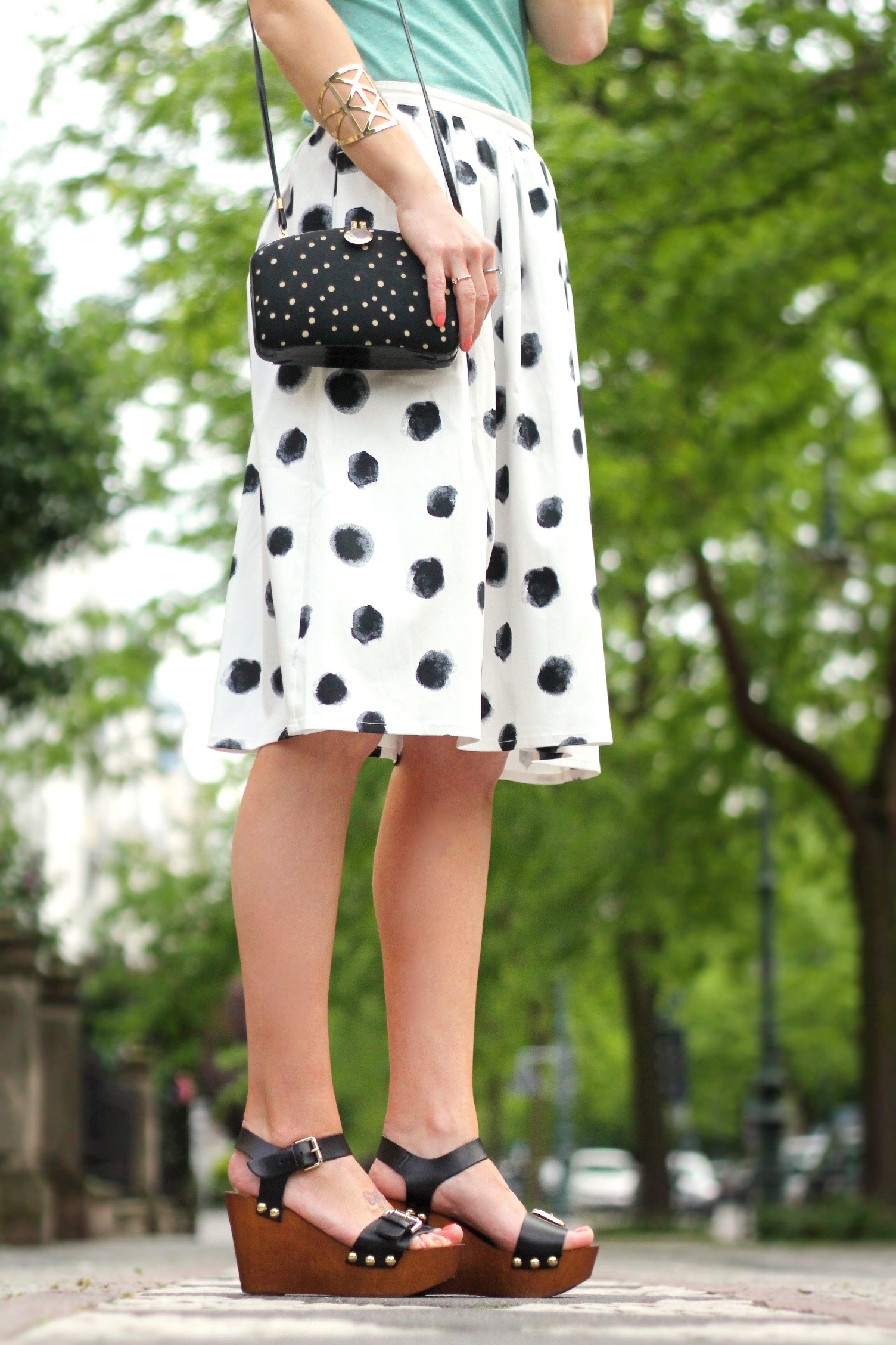 Welcome June, welcome meteorological start of Summer. This outfit includes this pretty midi dotted skirt by ‚mint & berry‘. It is one of my latest additions to my summer wardrobe. I love the length and the dots all over print. I wore it with some high but comfy wedge heel sandals and a simple top. I hope you like this outfit. xx Ina