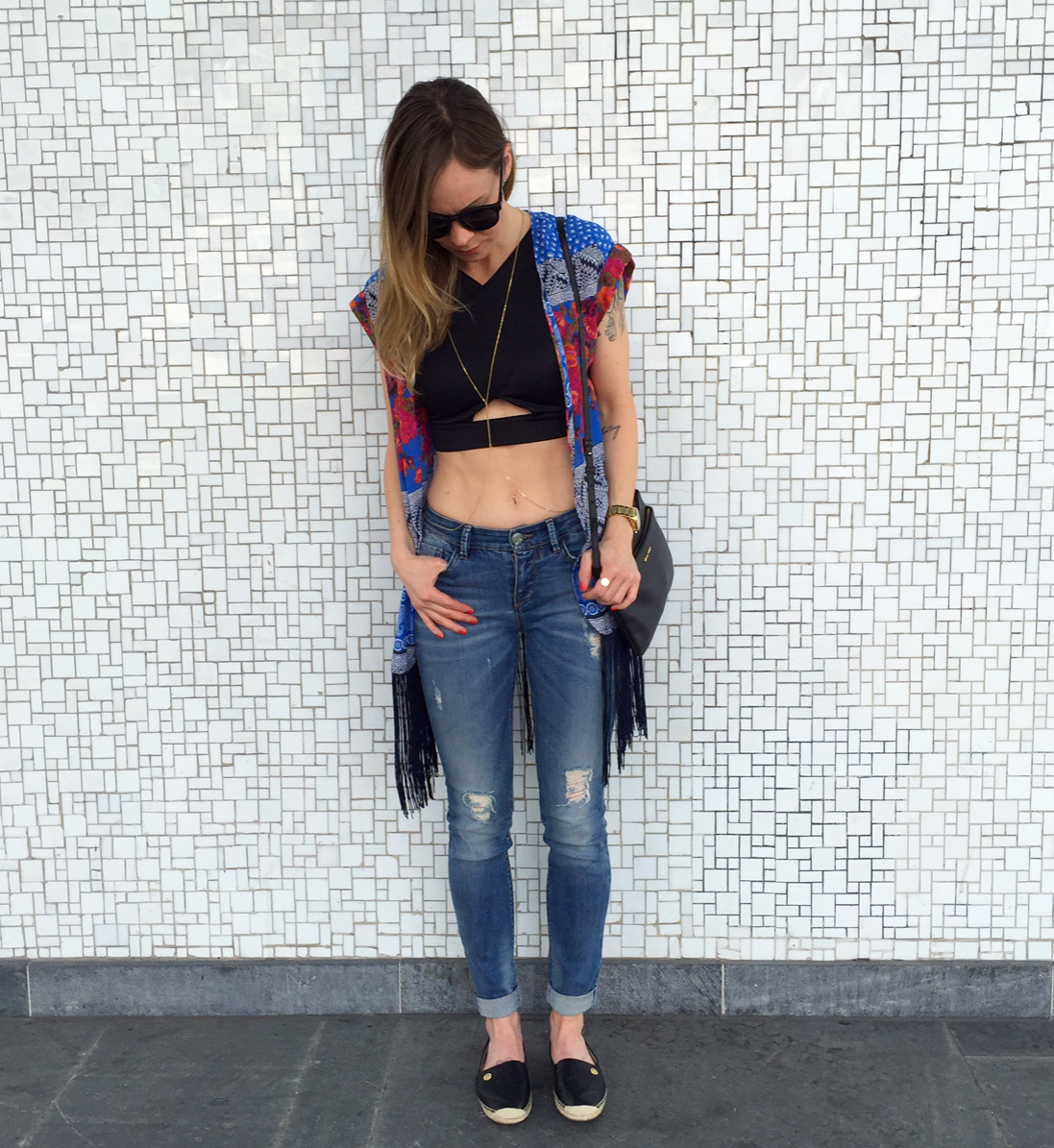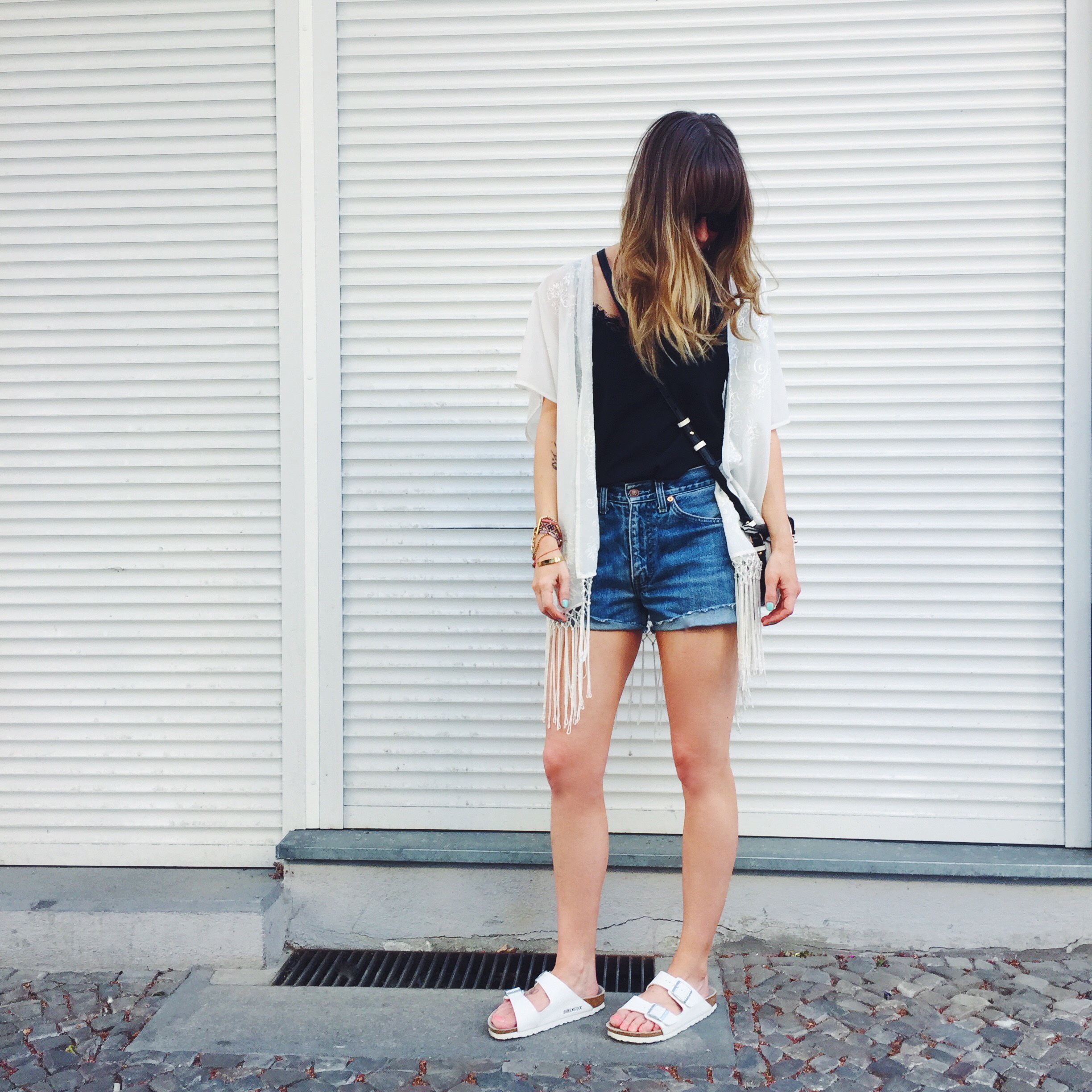 outfit on a hot sunny day: birks, poncho & jeans shorts.
