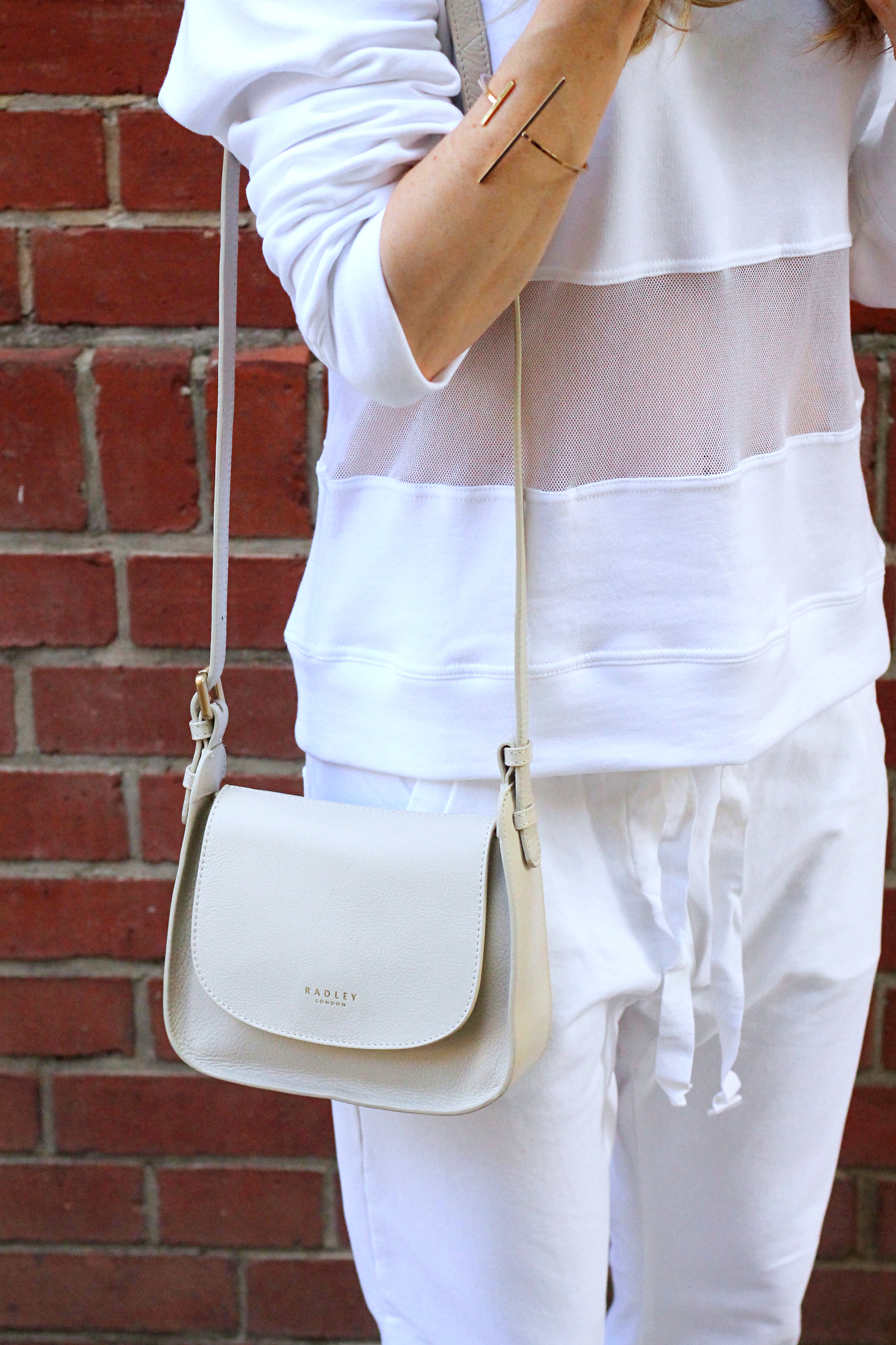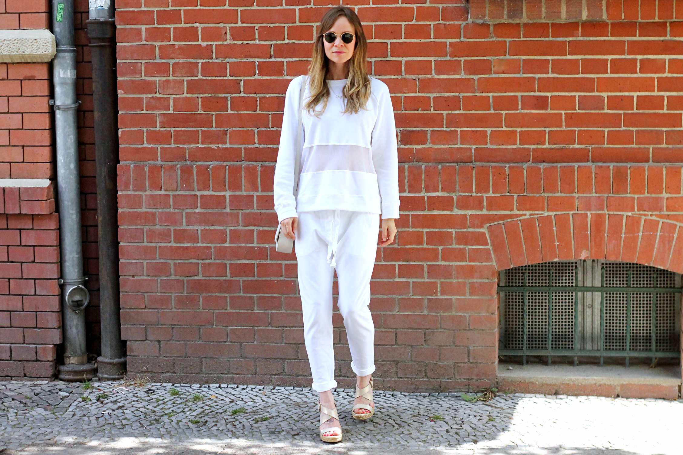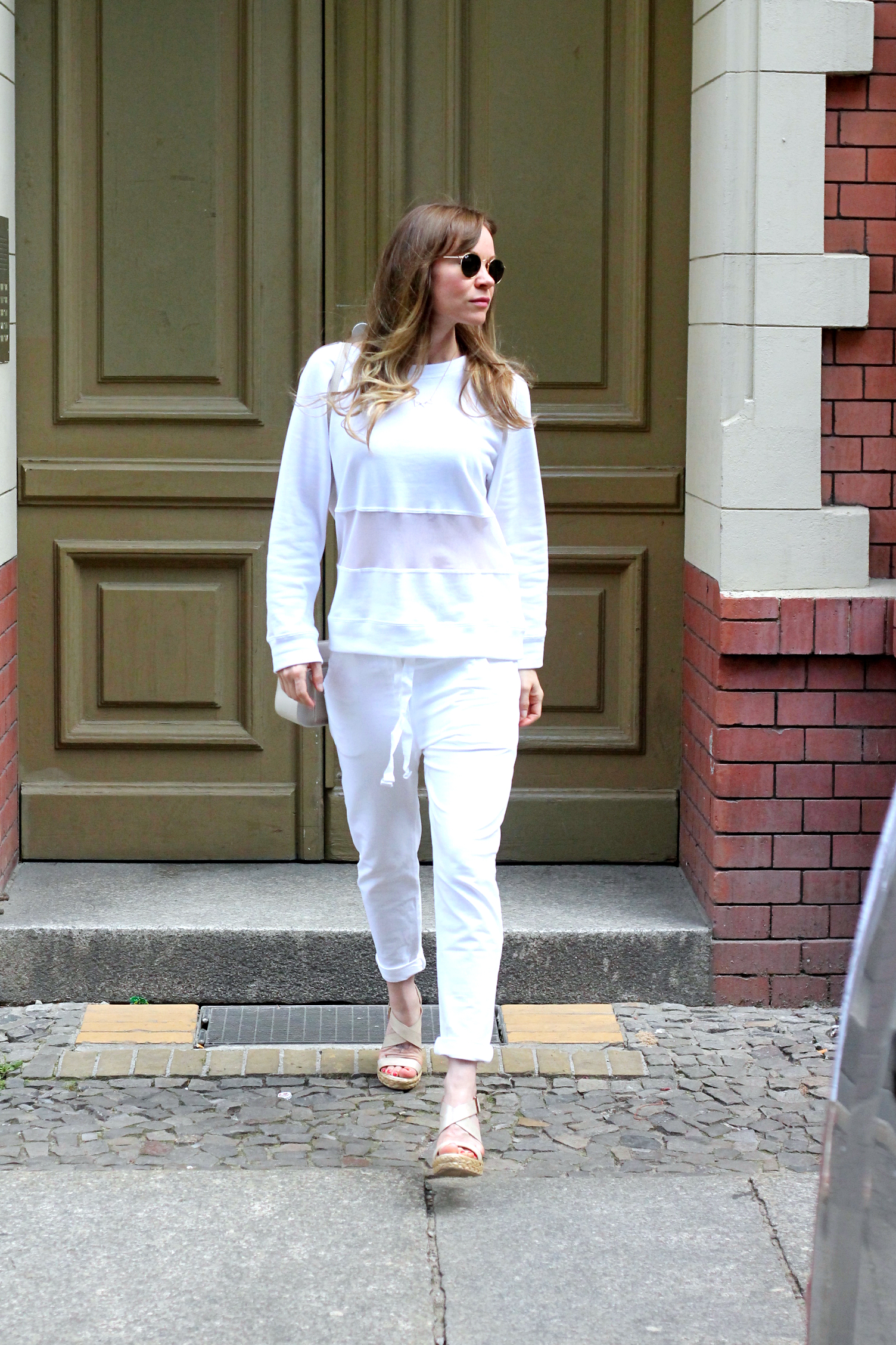 Today I create an all-white look for you with this beautiful sustainable and green produced sweater by Jan’n June. Check out the beautiful handmade work by two girls from Hamburg here. I teamed it up with a jogging pants and some wedges and my favorite little bag from ‚Radley‘. I hope you like the way how I styled this all-white look. Feel inspired but beware: You might want to hold your morning coffee at a distance. xx Ina