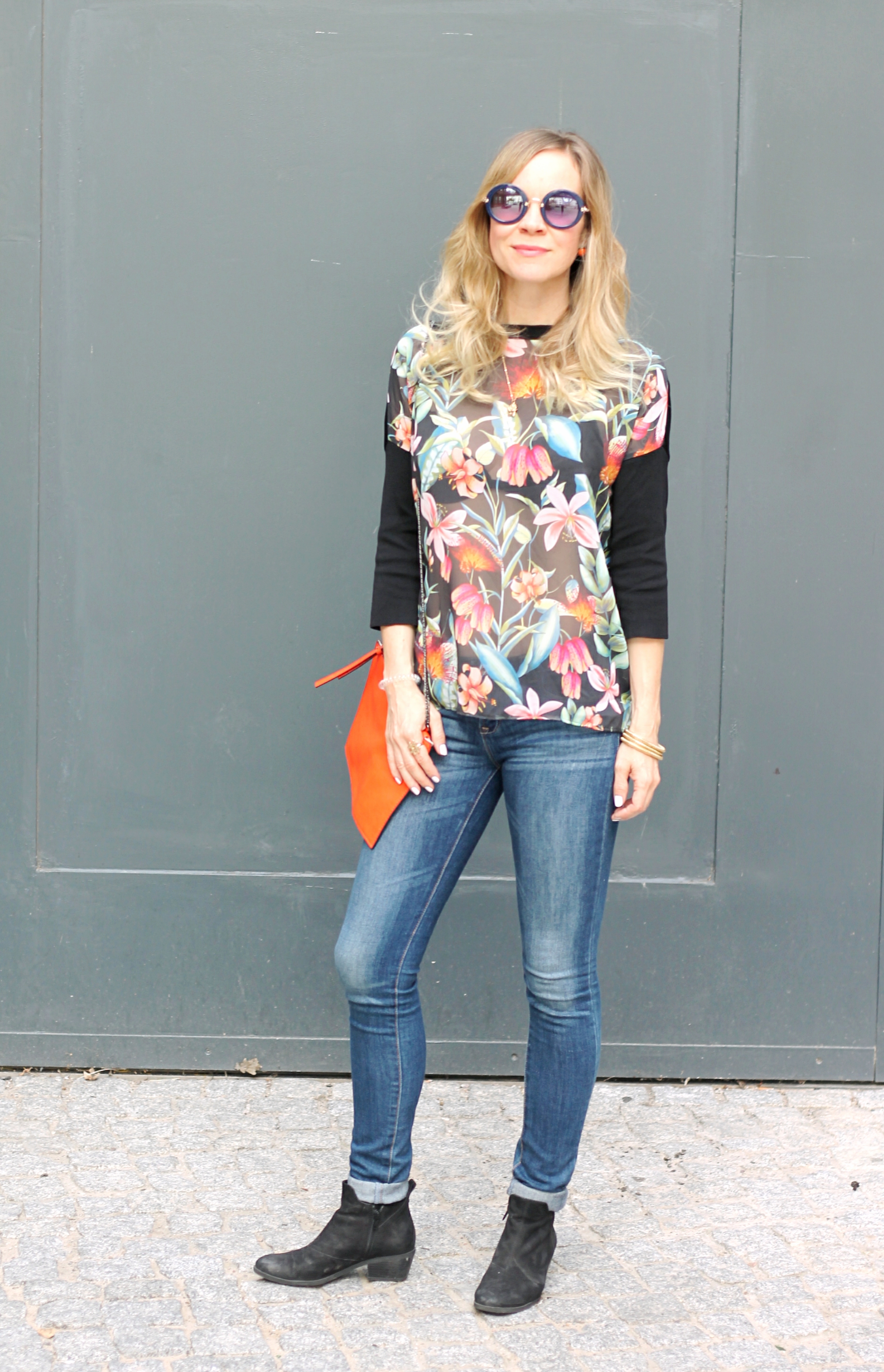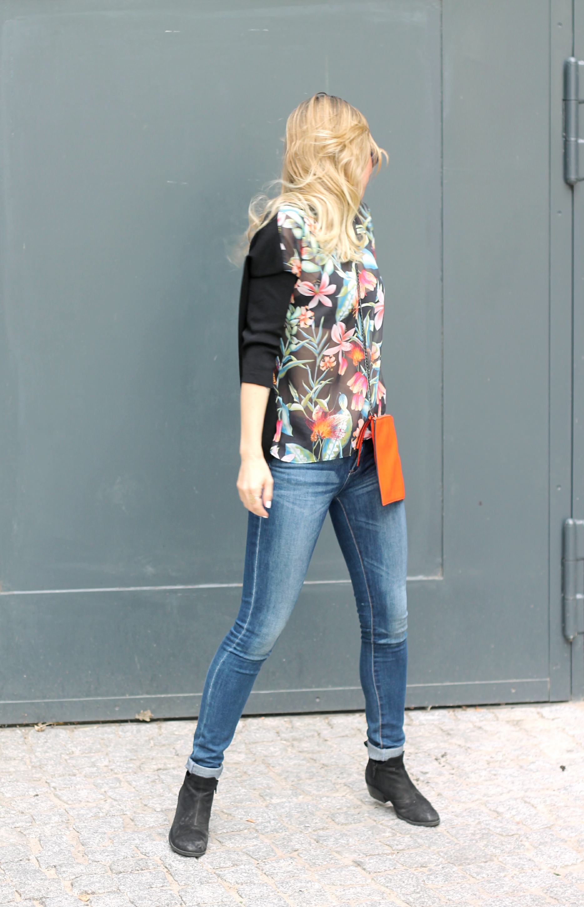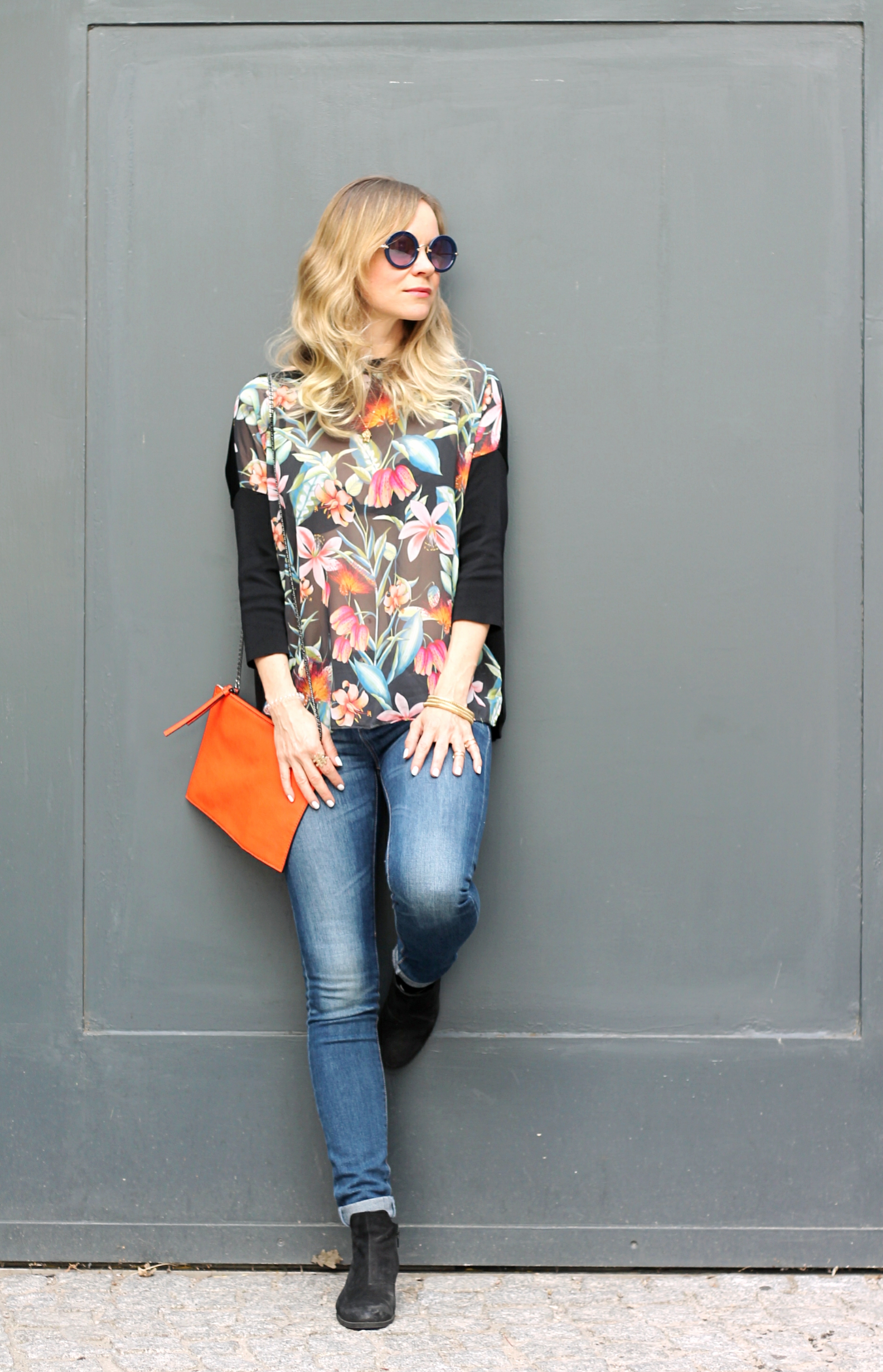 The weather in Berlin was gray and autumnal the last 3 days. To make your day more colorful, I show you an outfit with this beautiful floral top from Zara (I bought it recently at ‘Sale’, so unfortunately I can recommend you only a similar- please see below). I combined this outfit with some orange accessories. The rest is more simple and restrained. Have a beautiful start of the week.