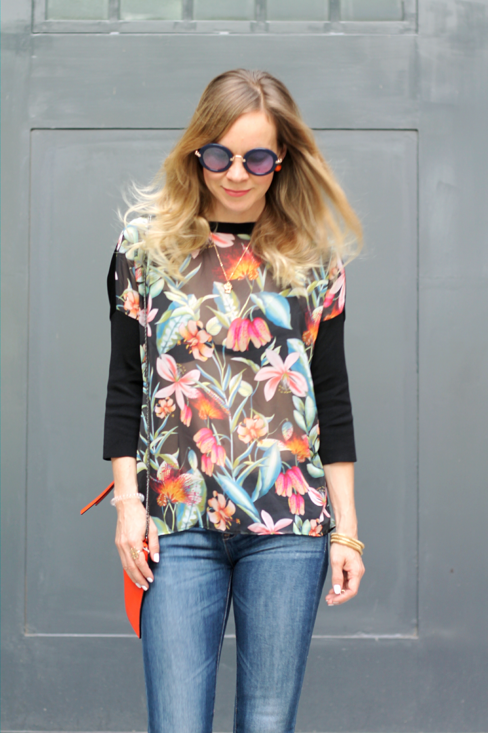 Das Wetter in Berlin war grau und herbstlich die letzten 3 Tage. Um Euren Tag etwas farbenfroher zu machen, zeige ich Euch heute ein Outfit mit diesem schönen floralen Shirt von Zara (Hab es letztens im ‚Sale‘ erstanden, deshalb kann ich Euch leider nur ein Adäquat empfehlen – siehe unten). Kombiniert habe ich dazu orangefarbene Accessoires. Den Rest habe ich eher schlicht und zurückhaltend gestaltet. Wie findet Ihr’s? Ich wünsche Euch einen schönen Wochenanfang.