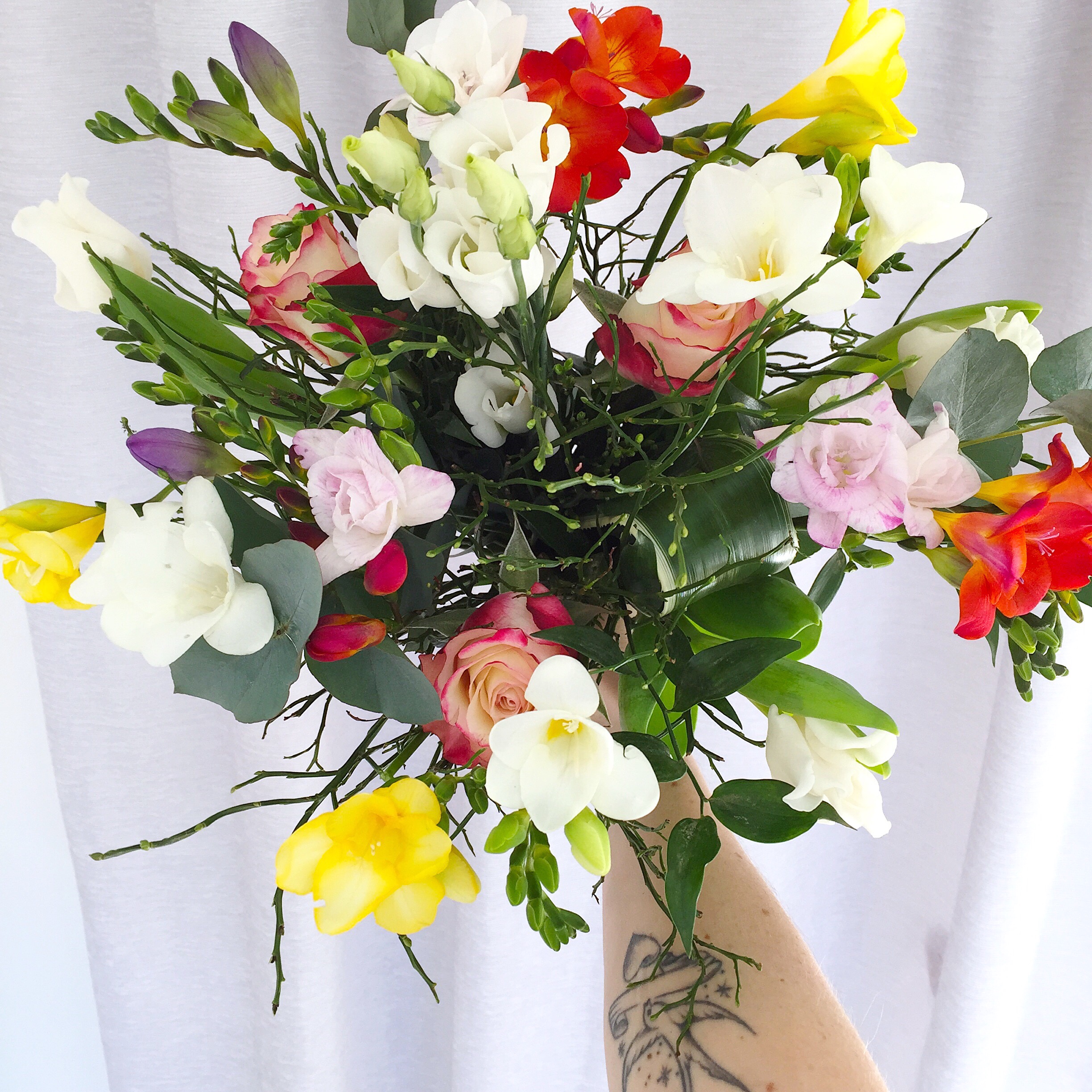 #ootd with cozy cardigan, floral top, a big bun and my ‚Supertrash‘ from ‚Mondelli-Lifestyle‚