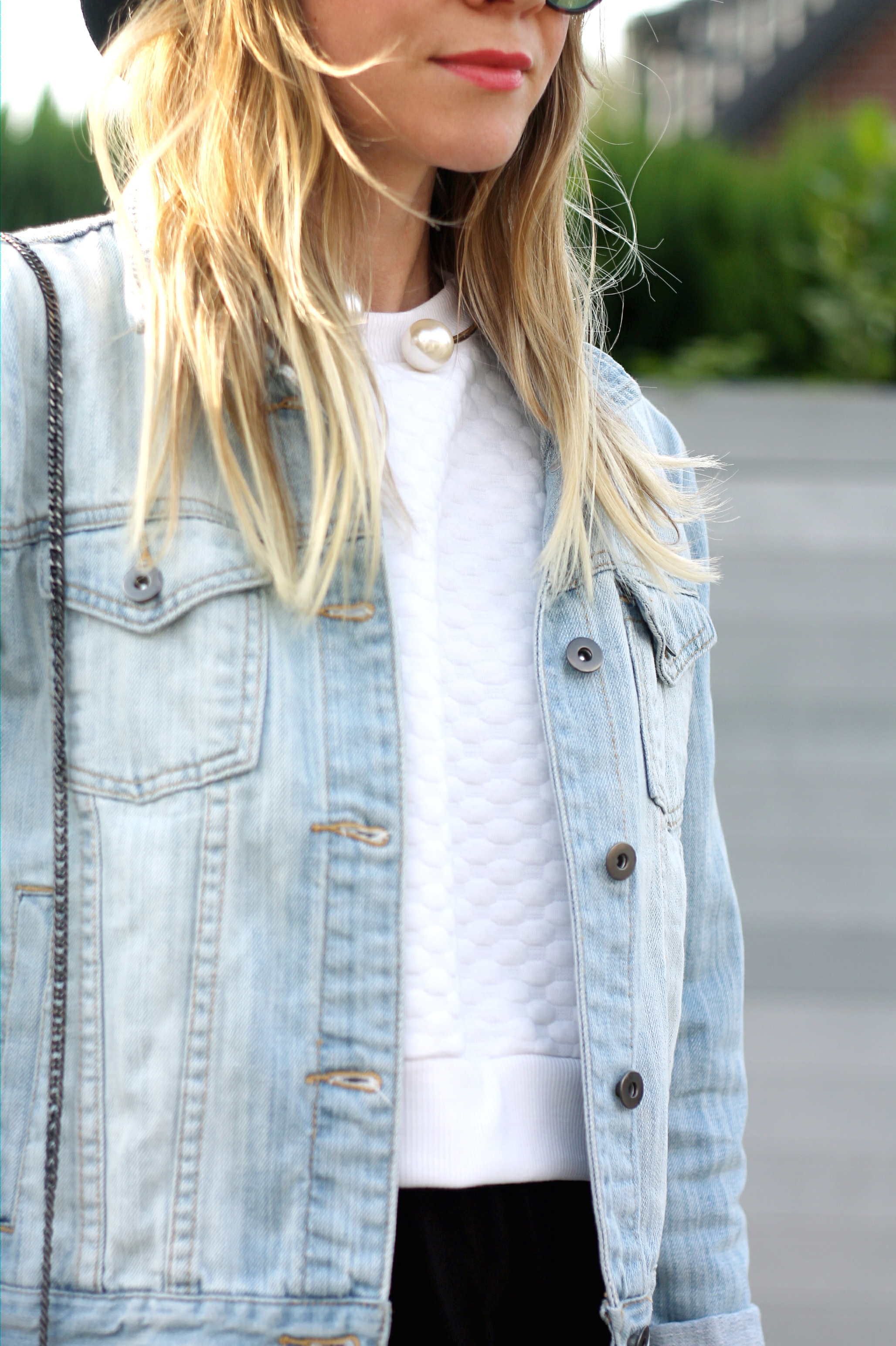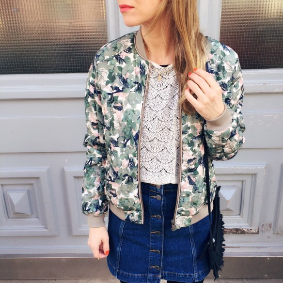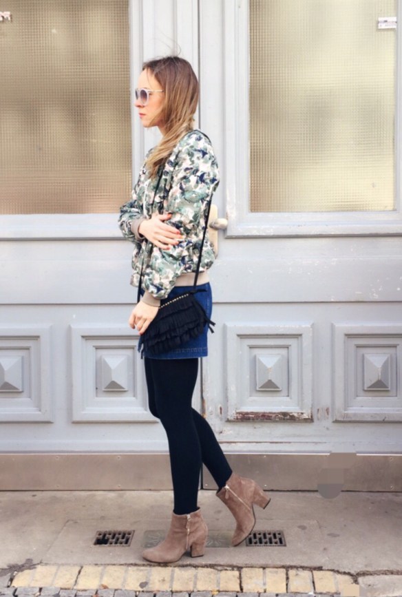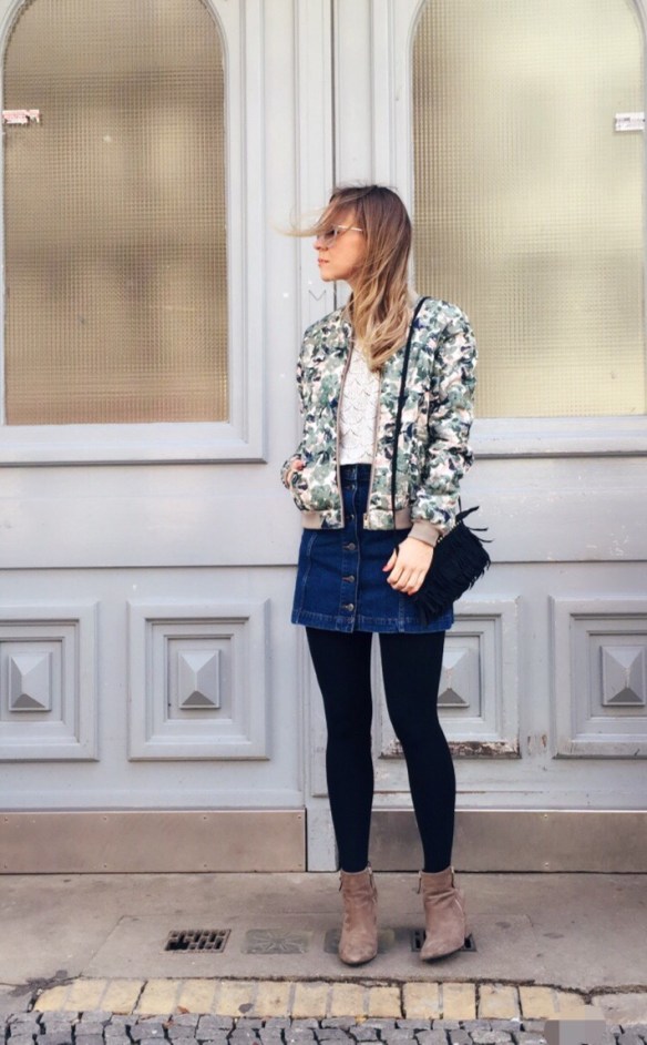 Currently the temperatures especially in the morning hours remember on winter time and spring is still missing. Nevertheless I defy to all the weather-up-and-down and the cold grey outside and wear some friendly colors. I’m totally in love with my new jeans skirt in A-form. I’m looking forward to the summer when I can wear this beautiful piece without tights and with some sandals or espadrilles. This time I combined my jacket from Modström to it. I like the pattern and color combination of this jacket very much. I hope you like my look and I wish you a happy Easter time. XX Ina